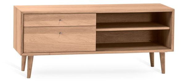 Tv-tasossa on vasemmalla kaksi avointa hyllyä medialaitteille ja oikealla kaksi laatikkoa, jotka tarjoavat siistiä piilotettua säilytystilaa. Laatikoissa on kauniit hopeanväriset metallivetimet sekä soft-close-mekanismi, ja sorvatut massiivitammijalat viimeistelevät laadukkaan ja huolitellun kokonaisuuden.