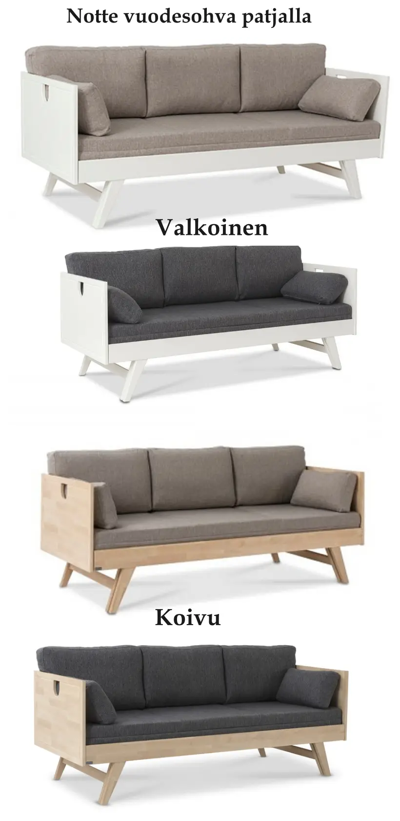 Notte Vuodesohva tarjoaa kotimaista laatua, helpon levitettävyyden ja ajattoman tyylikkyyden. Se yhdistää käytännöllisyyden ja selkeän muotoilun tavalla, joka sopii täydellisesti moderniin kotiin.