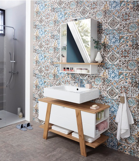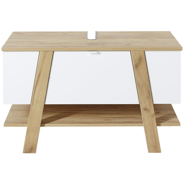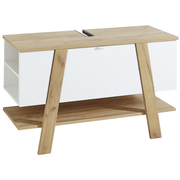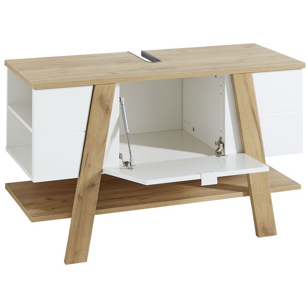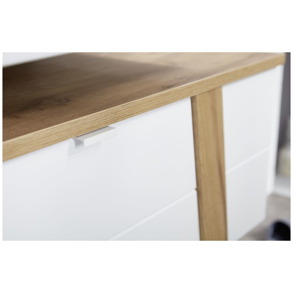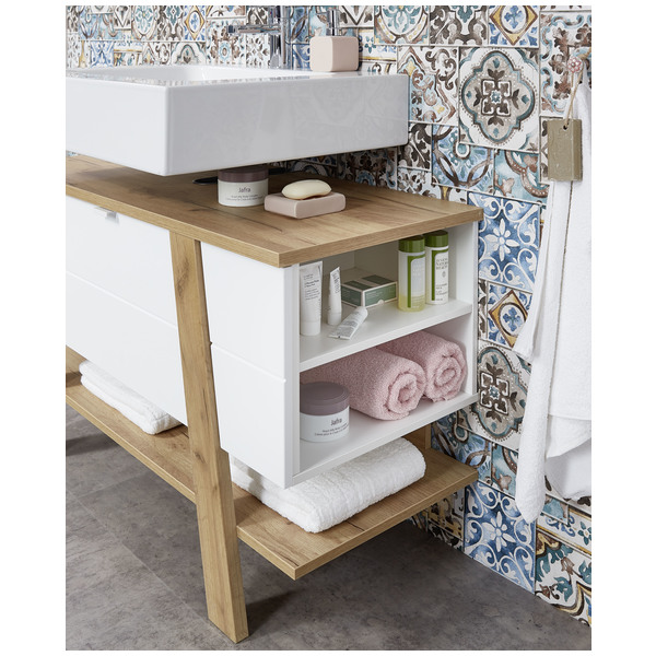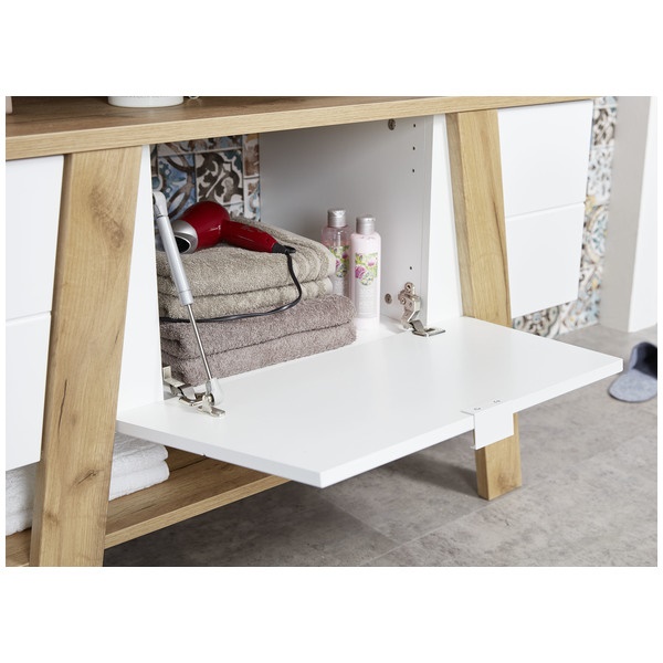 Sanoma tammi/valkoinen -värivaihtoehto yhdistää raikkaan valkoisen rungon ja lämpimät tammen sävyt, tuoden kylpyhuoneeseen harmonisen ja modernin ilmeen. Optimaaliset mitat — leveys 110 cm, syvyys 45 cm ja korkeus 66 cm — sekä 36,70 kg paino takaavat tukevuuden ja sopivuuden monenlaisiin tiloihin.