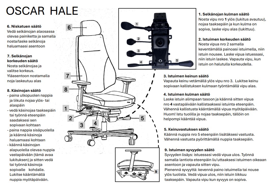 Oscar Hale -työtuoli on suunniteltu tarjoamaan pitkäkestoista istumamukavuutta ergonomisten säätöjen avulla, ja sen monipuolinen mekanismi mukautuu tarkasti käyttäjän tarpeisiin. Istuinkorkeuden, kallistuksen, istuinsyvyyden ja selkänojan kulman säätö varmistavat tuen kaikissa työasennoissa, samalla kun painon mukaan säätyvä keinuvastus lisää liikkumisen vapautta.