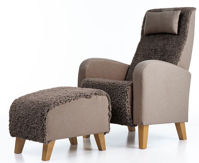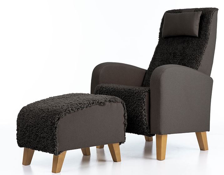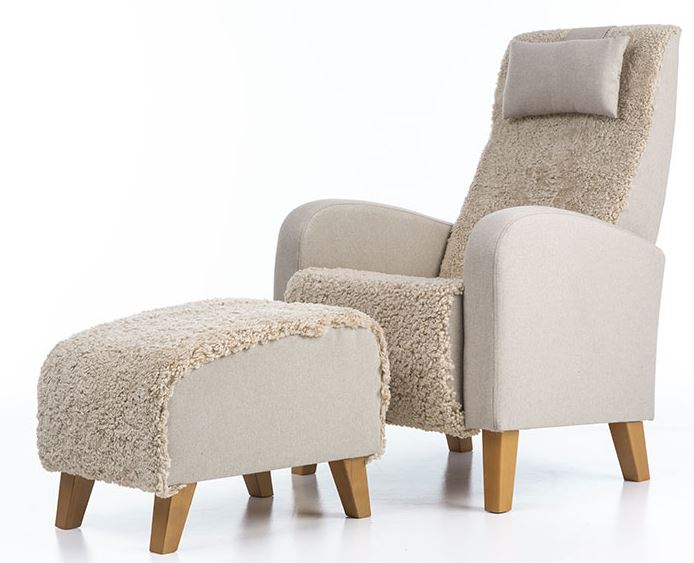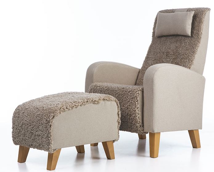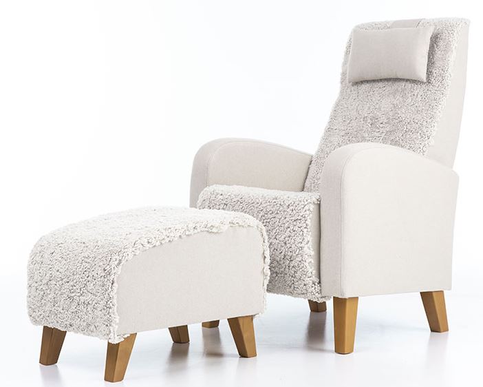 • Korkeaselkäinen ja siro Otto nojatuoli aidolla lampaannahalla verhoiltuna jossa tuolin sivu ja niskatyyny on kangasta. Perinteisen mallinen Otto nojatuoli on helppo sijoittaa erilaisiin tiloihin. Otto nojatuolin istuinmukavuus on napakka ja miellyttävä ja nojatuolin ryhdikkään selkänojan ansiosta tuolissa voi istua pitkiäkin aikoja ja lisämukavuutta antaa nojatuolin niskatyyny, jonka korkeutta voi muuttaa. Otto nojatuoli on kevyt ja helppo siirtää paikasta toiseen. Otto nojatuolissa on korkeat jalat, jotka antavat tuolille ilmavuutta, mutta tekevät myös tuolin alta siivoamisesta helppoa.