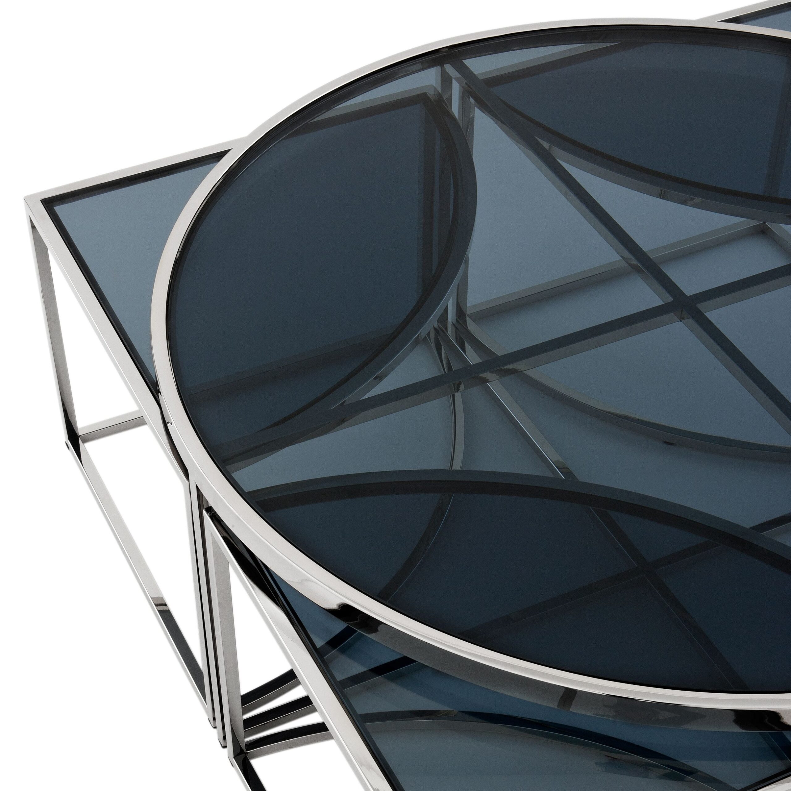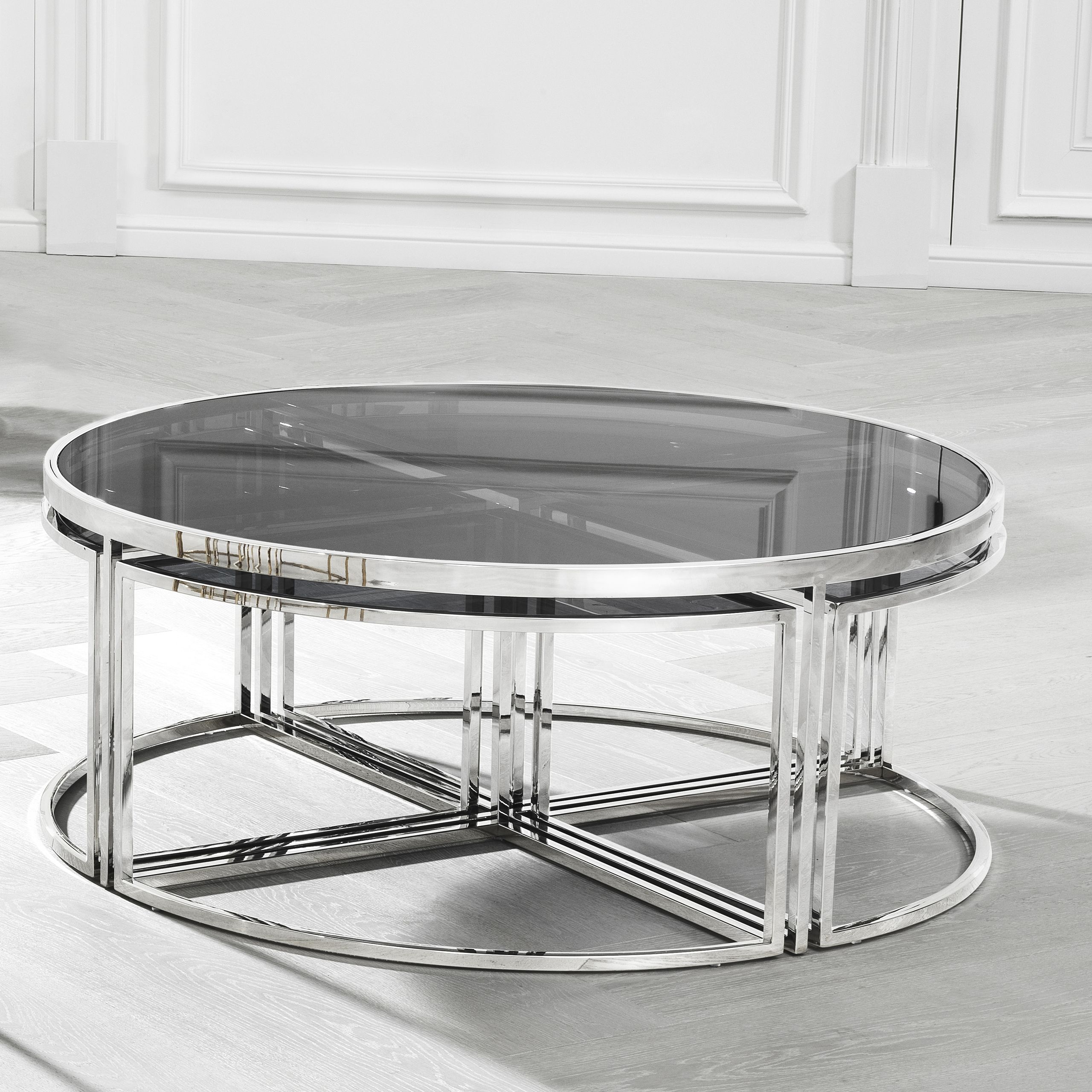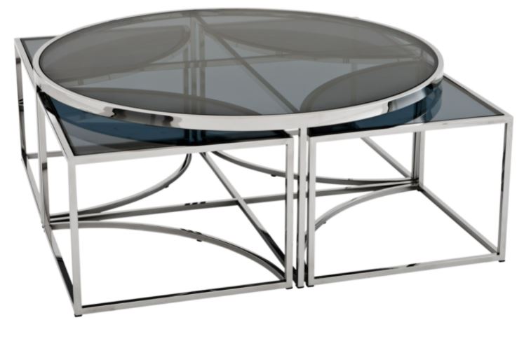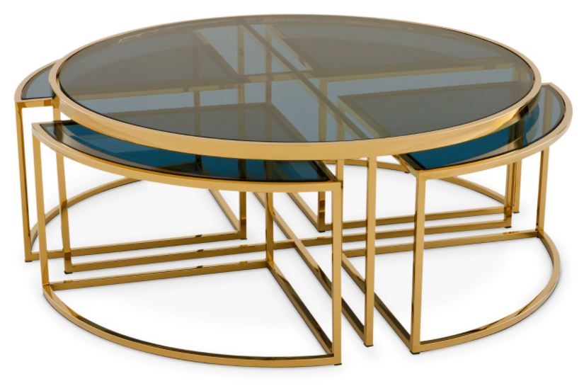 Pöydän alla neljä kätevää pikkupöytää, jotka voit asetella haluamallasi tavalla. Pöytää saatavana kahdessa eri värissä. Viettelevän kultaisen tai hopean viimeistelyn ja savulasisen pöytälevyn ansiosta tämä tyylikäs huonekalu lisää kotiisi vertaansa vailla olevaa design-tyyliä. Toimitus osissa.