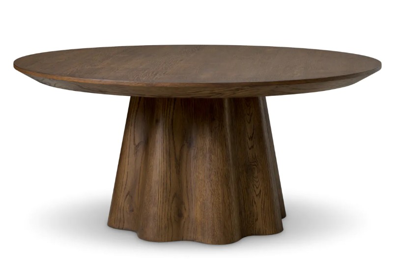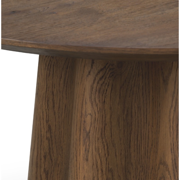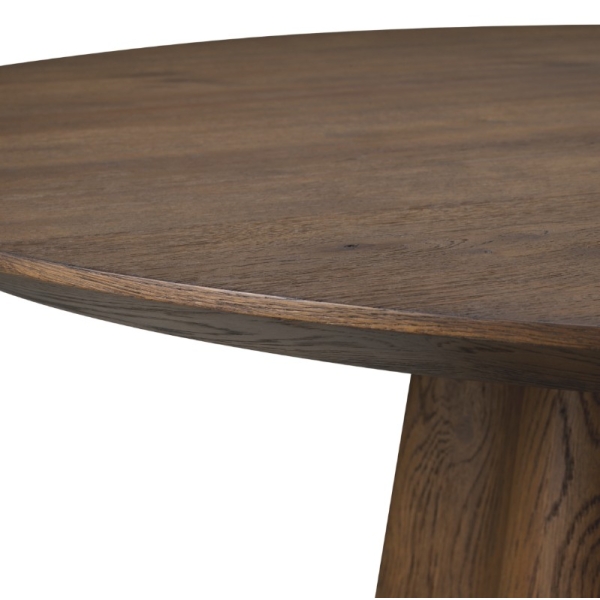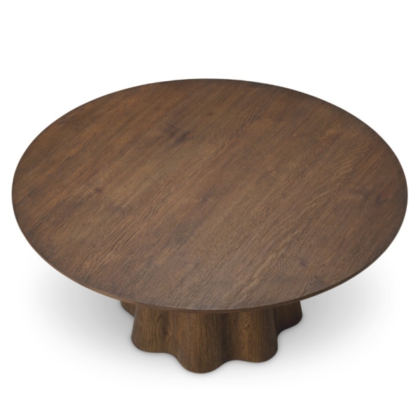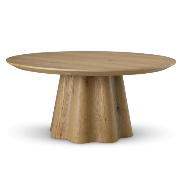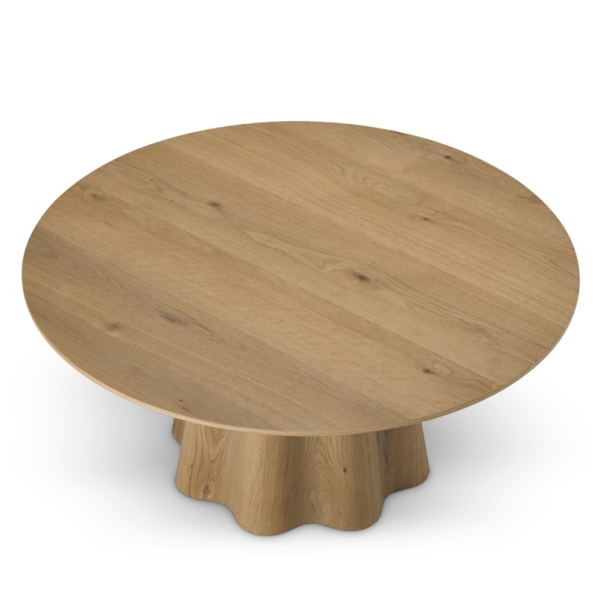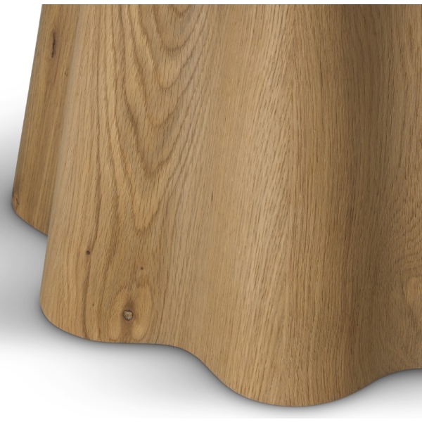 Runsas tammiviilu ja kauniin avoin puunsyy tuovat pintaan luonnollista syvyyttä ja lämpöä. Orgaanisesti kaareva jalkaosa luo vahvan arkkitehtonisen ilmeen, joka tekee pöydästä enemmän kuin pelkän laskutason. Sculptural base -rakenne yhdistää kestävyyden ja estetiikan, tehden pöydästä pitkäikäisen sijoituksen laadukkaaseen kotiin.