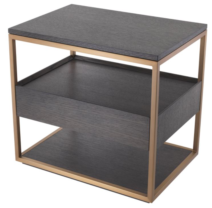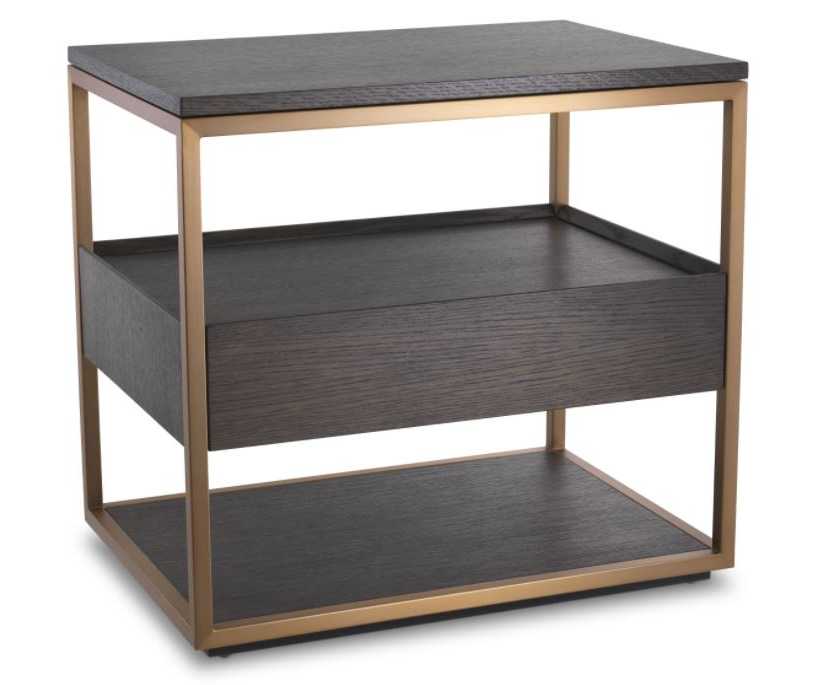 Parker-yöpöytä yhdistää mokansävyisen viilun ja messinkiviimeistellyn kehyksen, luoden makuuhuoneeseen ylellisen ja harmonisen ilmeen. Sen tyylikäs, huoliteltu muotoilu sulautuu vaivattomasti niin moderniin kuin klassiseen sisustukseen.