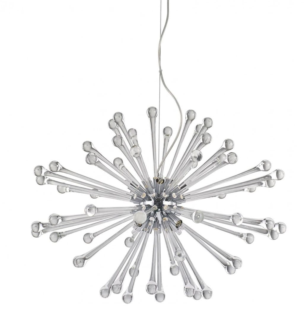 - Moderni riippuvalaisin jonka korkeutta voidaan säätää teräsvaijereista. Valaisimesssa käsin puhelletut lasiosat. Desing Italia. Toimitus osissa.