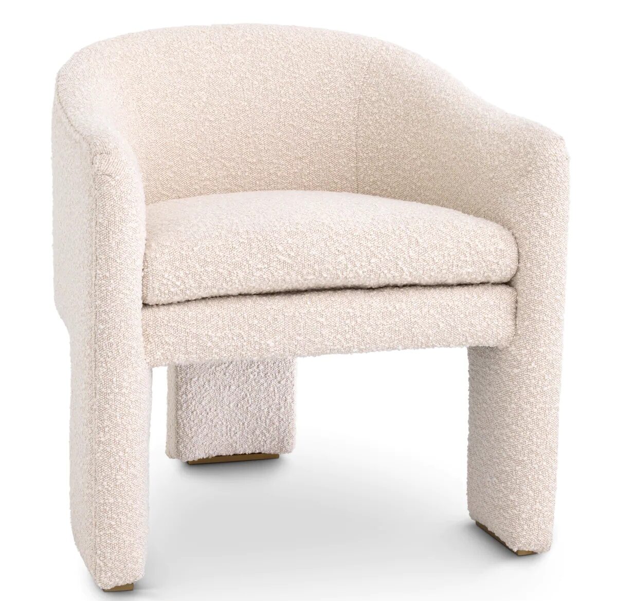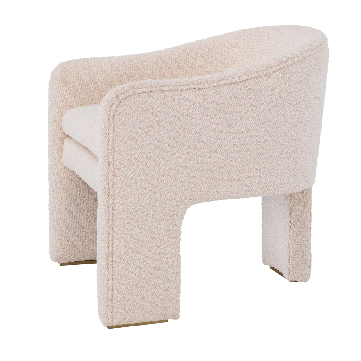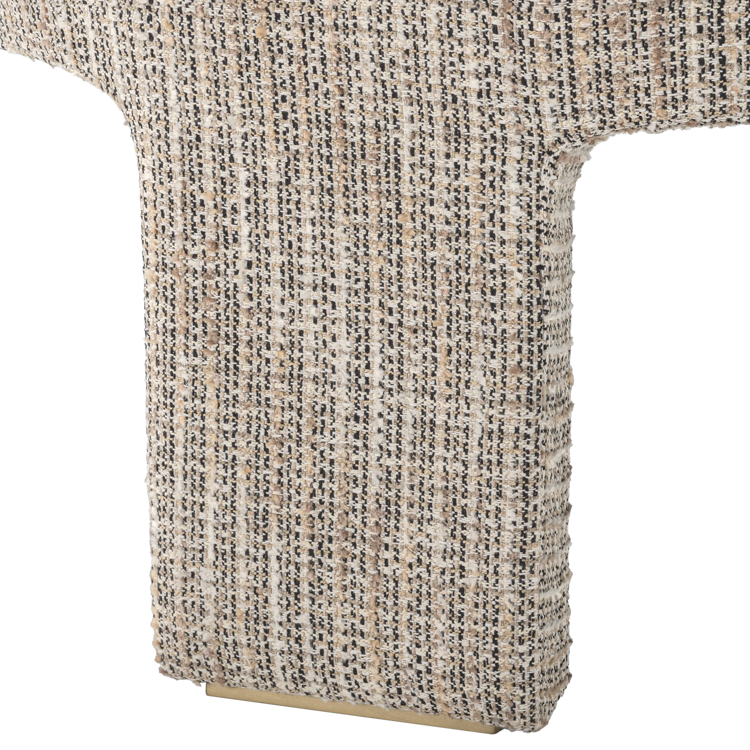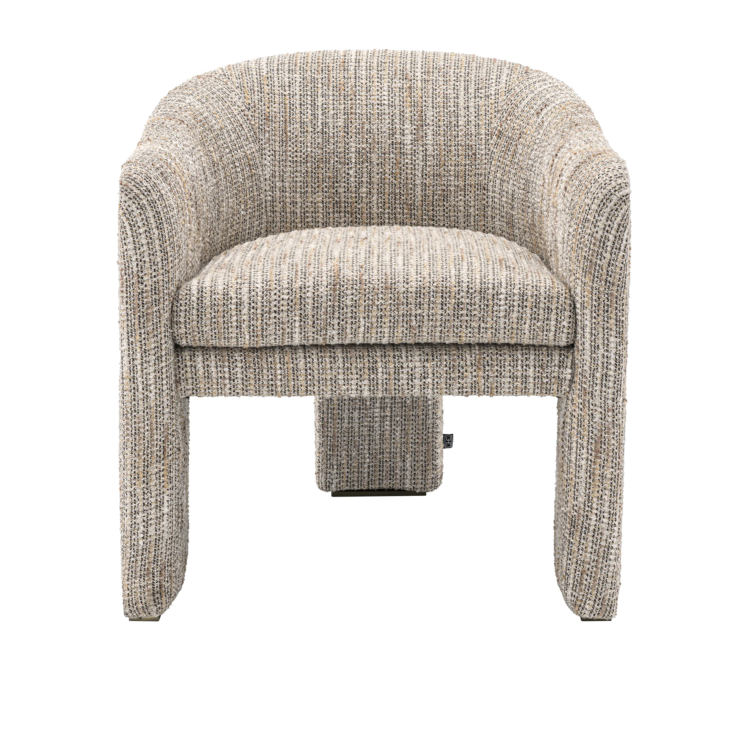 Bouclé-kankaan ja MAdemoiselle-sekoitteen yhdistelmä tuo verhoiluun sekä kestävyyttä että miellyttävää pehmeyttä. Saatavilla olevat kerman- ja beigensävyiset vaihtoehdot korostuvat kauniisti harjattuja messinkijalkoja vasten, luoden elegantin ja viimeistellyn kokonaisuuden.