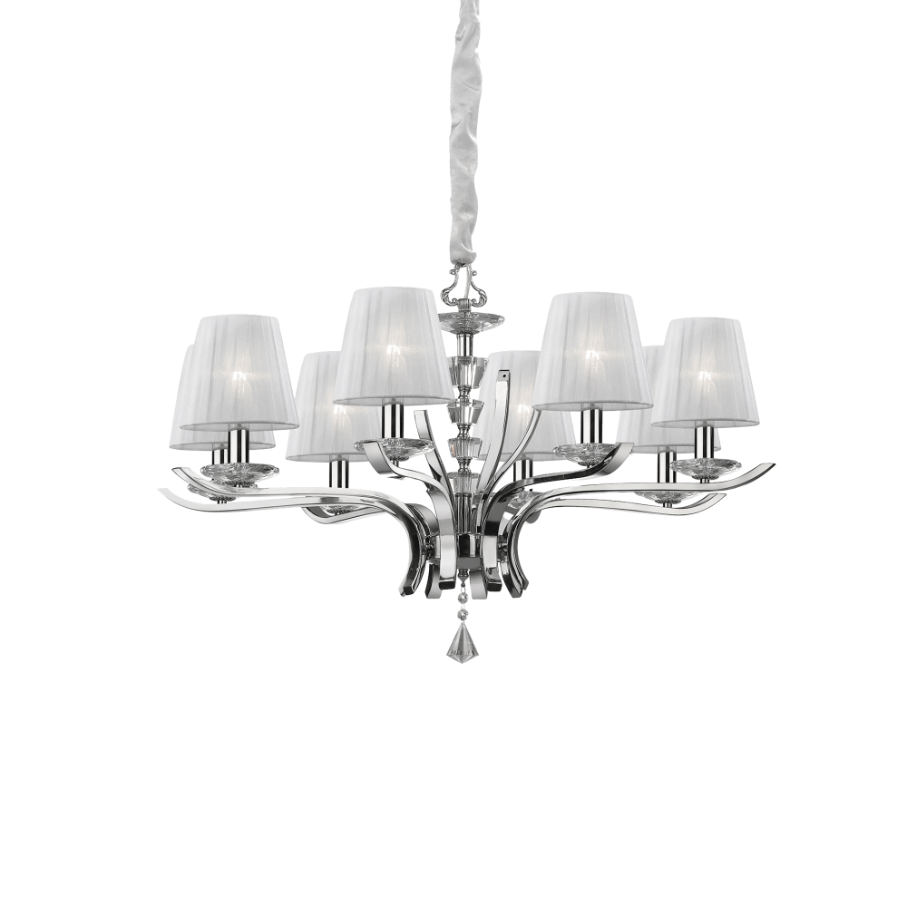 Upea metallirunkoinen Pegaso SP kruunuvalaisin on näyttävä ja arvokas valaisin, jossa kristallimansetit, metallirunko ja pehmeät Organza-kangasvarjostimet muodostavat harmonisen kokonaisuuden. Italialainen design huokuu klassista eleganssia, tehden valaisimesta katseenvangitsijan ruokailutilaan, olohuoneeseen tai edustavaan aulatilaan.