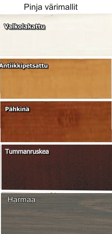 • Monipuoliset värivaihtoehdot: harmaa, antiikkipetsattu, pähkinä, tummanruskea ja kuultovalkoinen, jotka sopivat jokaiseen sisustustyyliin.