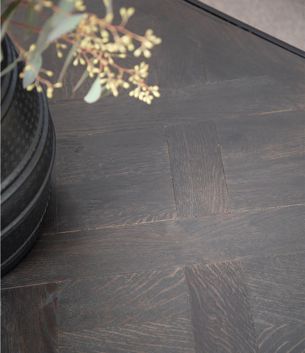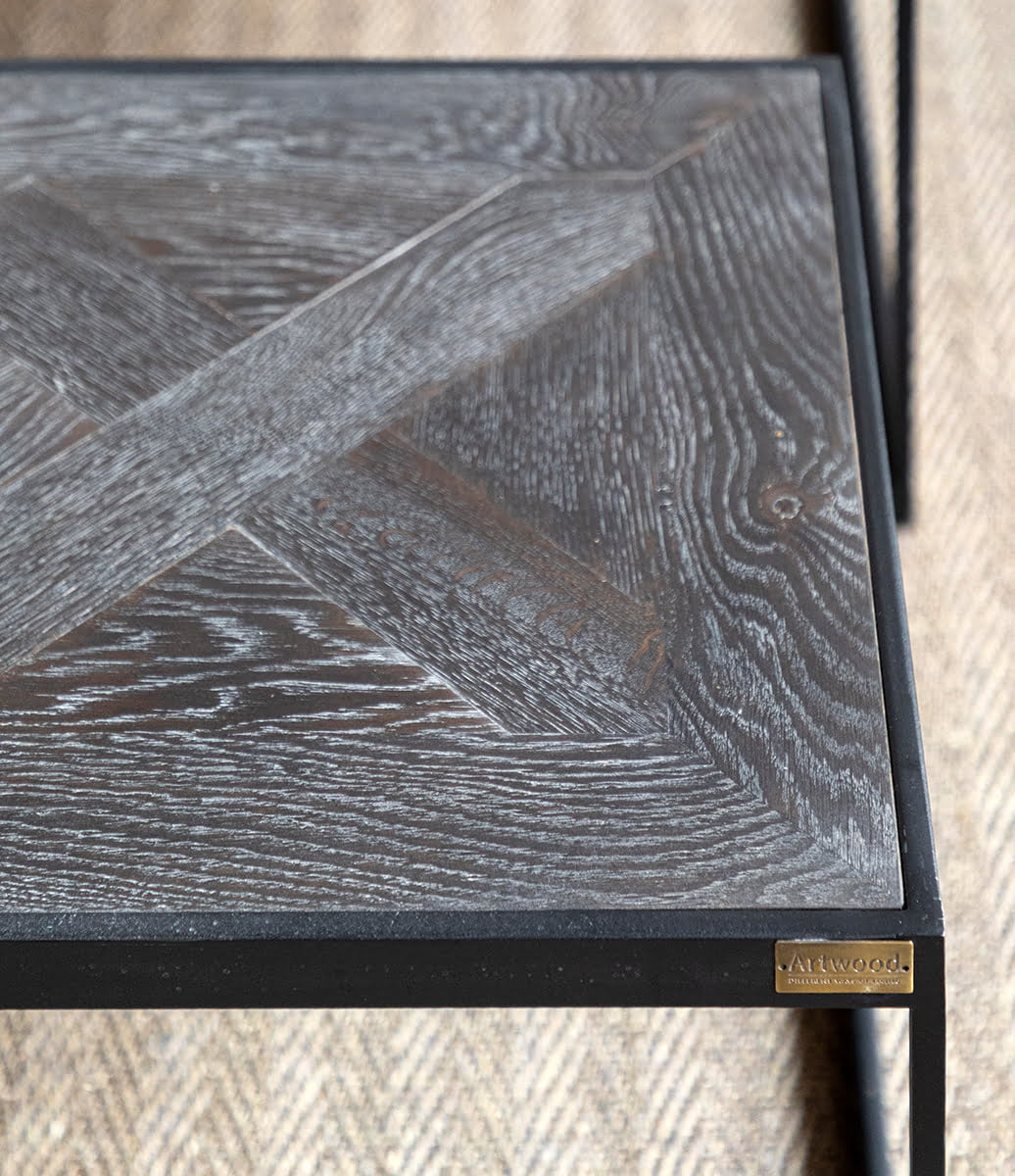 Pittsburgh-sohvapöytä yhdistää tyylikkään mattamustan metallirungon ja parkettikuvioisen tammiviilun, luoden elegantin ja monipuolisen ilmeen, joka sopii saumattomasti sekä moderneihin että perinteisiin sisustuksiin. Sen näyttävä mutta hillitty design tekee siitä olohuoneen luonnollisen katseenvangitsijan.