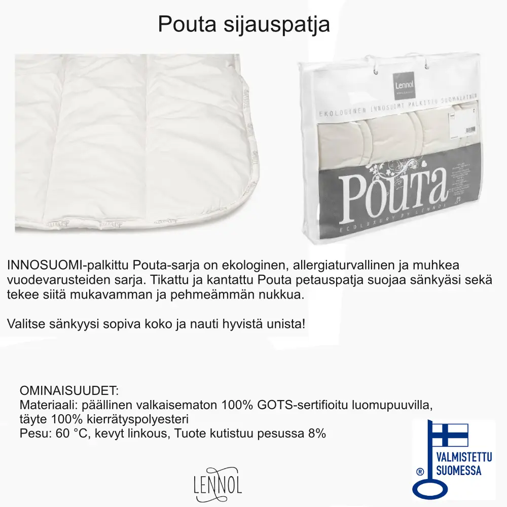 Pouta-petauspatjan täytteenä on palkittu INNOSUOMI ECO-vanu, joka on miellyttävä, allergiaturvallinen ja ympäristöystävällinen valinta. Tiheä tikkaus ja siistit reunat takaavat kestävyyden, ja luonnonvalkoinen 100 % ecopuuvillapäällinen tuntuu pehmeältä ihoa vasten. Petauspatja on vesipestävä 60 °C:ssa, joten se on helppo pitää raikkaana ja hygieenisenä vuodesta toiseen.