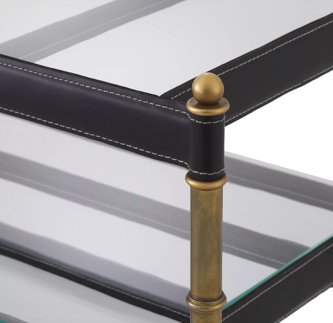 Princess-sohvapöytä yhdistää tyylikkään lasikannen, mustat nahkareunukset ja vintage-messinkisen rungon, luoden olohuoneeseen näyttävän ja ajattoman keskipisteen. Sen huoliteltu design tuo sisustukseen ripauksen luksusta ja sopii täydellisesti niin moderniin kuin klassisempaan tyyliin.