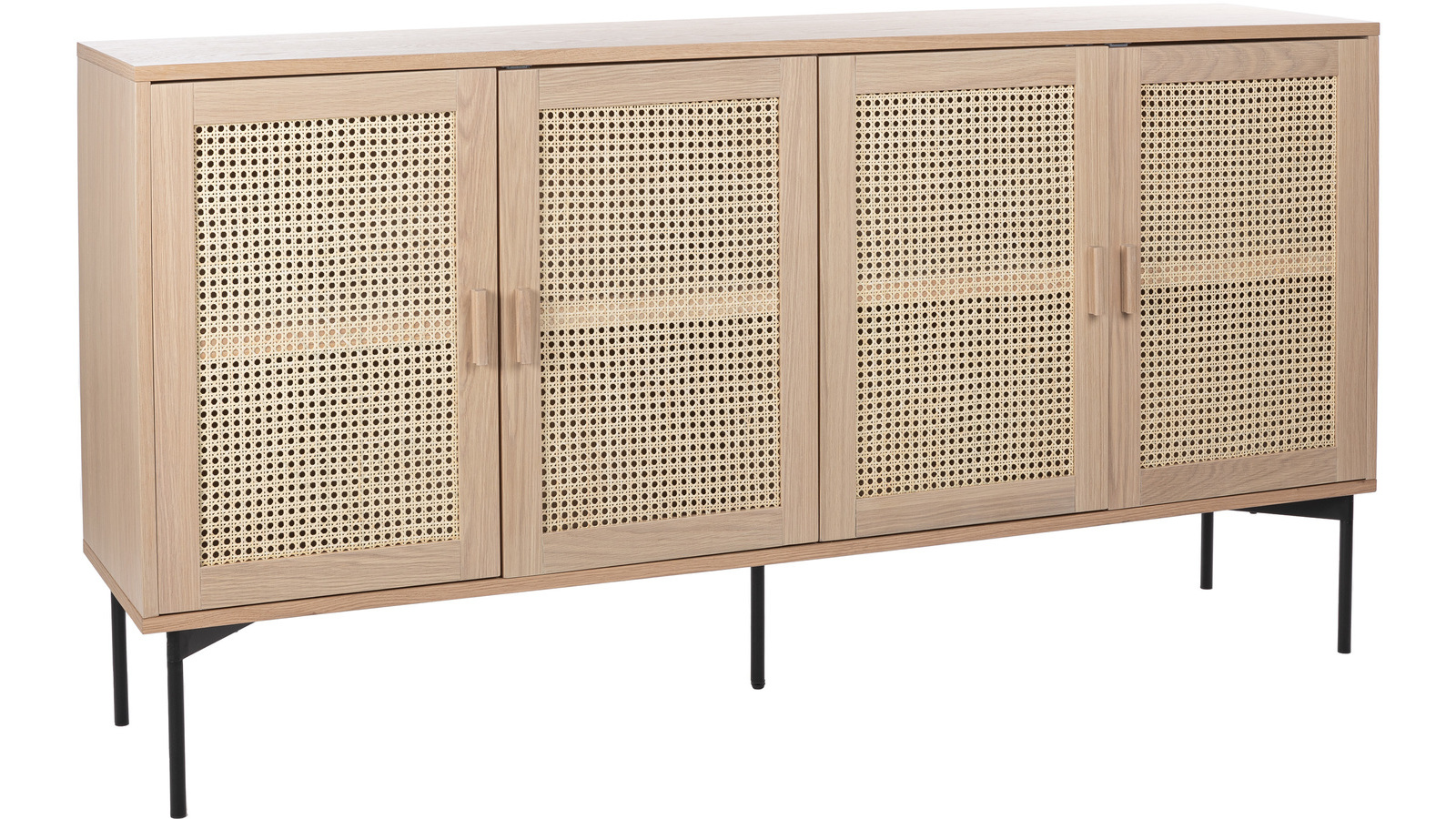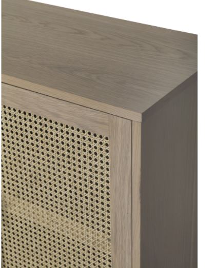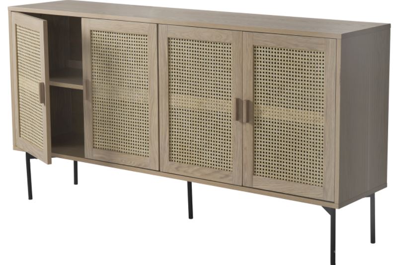 Upea puinen Raffels senkki on valmistettu tammesta ja sen jalat ovat metallia. Senkissä neljä ovellista kaappia, joissa etuosa on kauniisti punottu ja jokaisen kaapin sisällä on yksi välihylly.