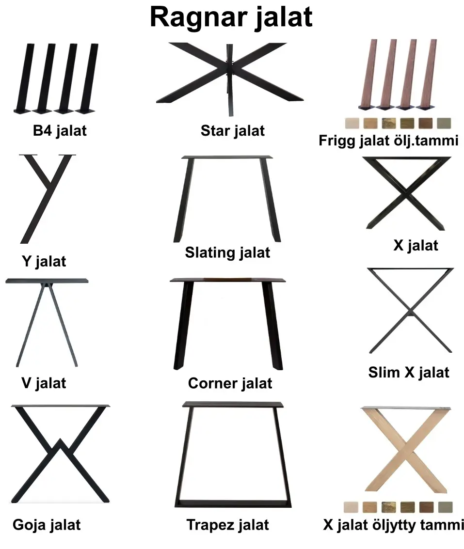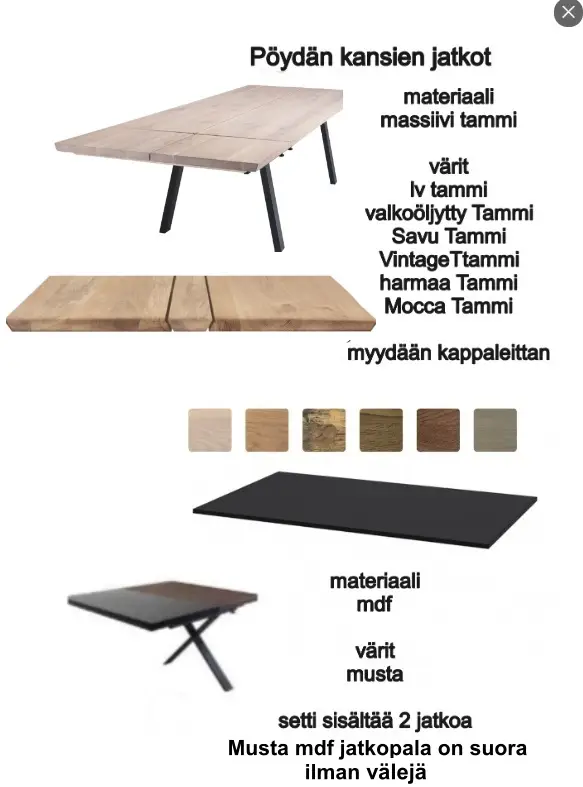 Ragnar-ruokapöydän 4 cm paksu tamminen kansi on käsitelty öljyllä ja lakalla, ja se on saatavana kuudessa eri öljykäsittelyn sävyssä. Kun tarvitset lisää tilaa, pöytään on mahdollista tilata yksi tai kaksi jatkopalaa lisähinnasta joko mustana tai tammisena, jolloin pöytä mukautuu helposti suurempiinkin kattauksiin.