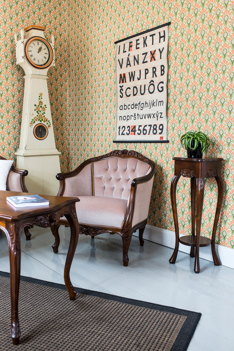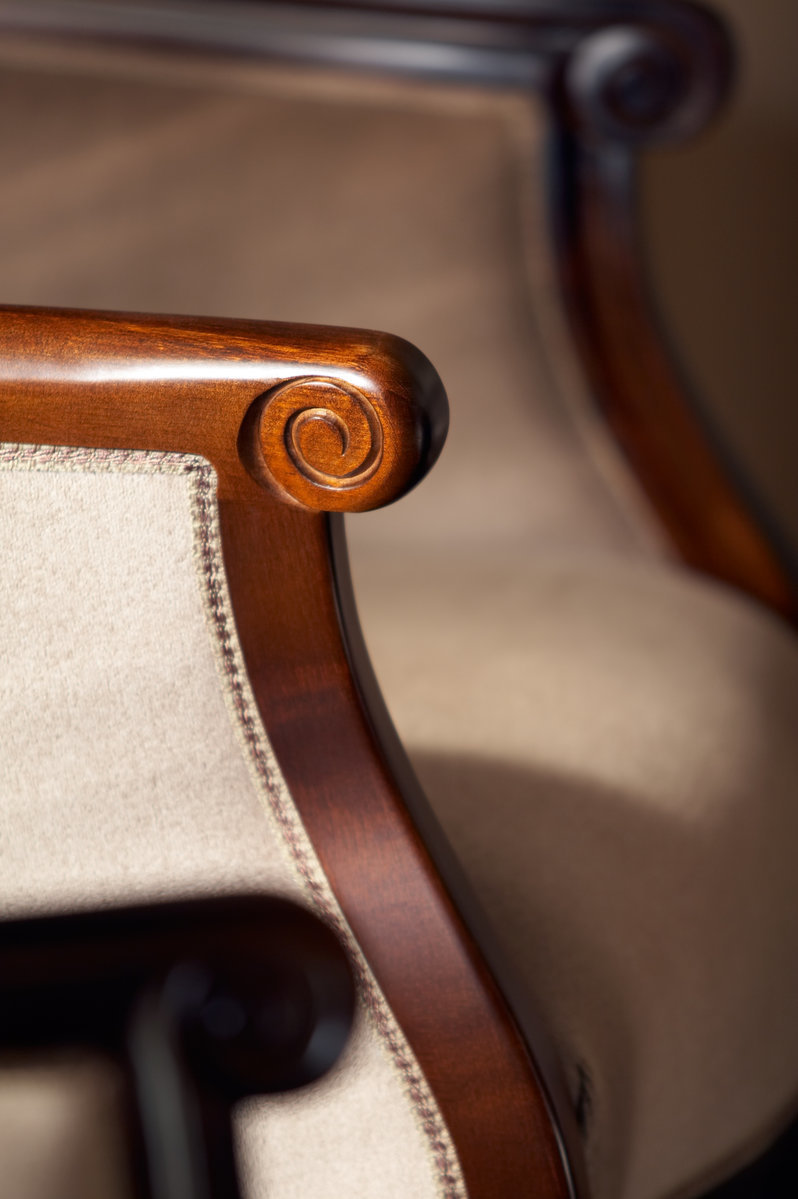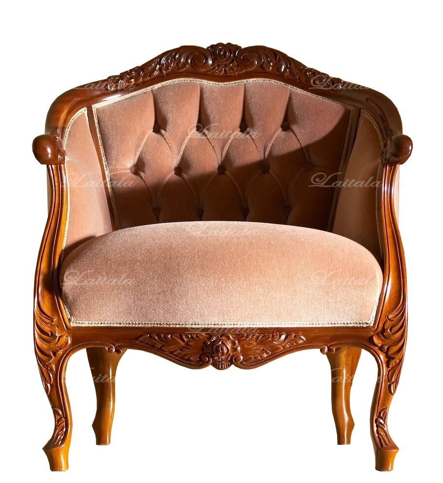 Ranskanrokokoo-nojatuoli on ympäriverhoiltu laadukkaalla mohair-kankaalla, joka yhdistää pehmeyden, kestävyyden ja ylellisen ilmeen. Halutessasi nojatuoli voidaan verhoilla myös muilla kankailla, ja lisäarvokkuutta tuovat käsin maalattavat kulta- tai harmaapatinoinnit.
