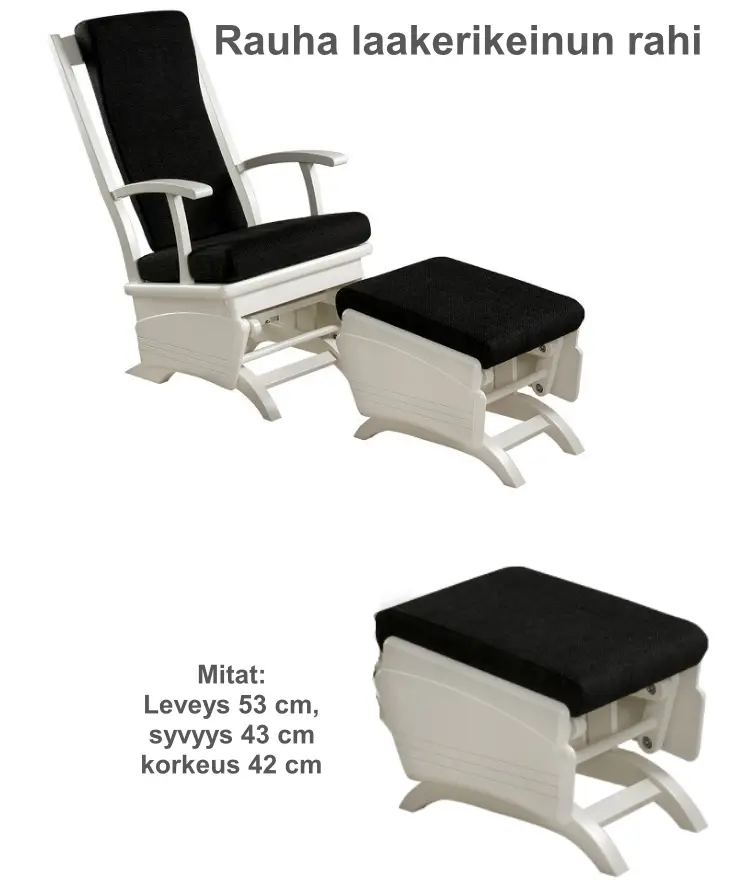 Rauha-keinu on saatavana viidessä kauniissa puuvärissä sekä useilla verhoiluväreillä, joista Daisy ja Manhattan Varasto kankailla toimitusaika on 1–3 viikkoa ja Daisy ja Manhattan tilauskankailla toimitusaika + 3 viikkoa viikkoa. Saatavilla myös muilla verhoiluilla ota silloin yhteyttä asiakaspalveluumme. Lisätilauksesta keinuun voi valita yhteensopivan rahin.