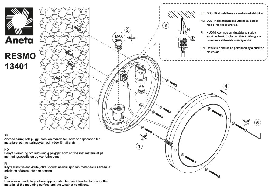 Resmo ulkoplafondi voidaan asentaa sekä kattoon että seinälle, mikä tekee siitä erittäin monikäyttöisen ratkaisun erilaisiin ulkotiloihin. Kaksi E27-polttimoa tarjoavat tehokkaan ja tasaisen valaistuksen, joka parantaa turvallisuutta ja tuo ulkotilaan miellyttävää tunnelmaa.