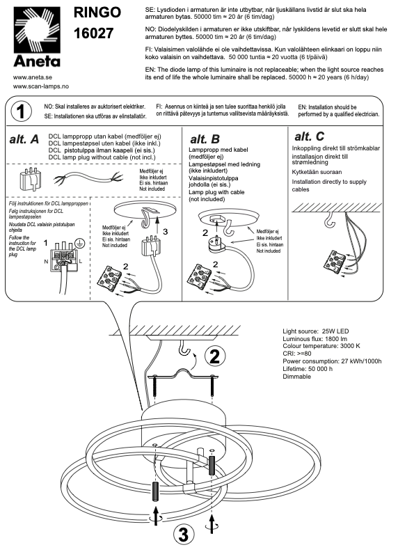 Metallin, alumiinin ja muovin yhdistelmä tekee valaisimesta kestävän mutta kevyen. Koukkukiinnitys helpottaa asennusta, ja matala rakenne (korkeus vain 12 cm) tekee Ringosta täydellisen myös matalampiin tiloihin.