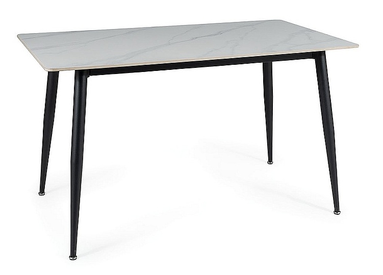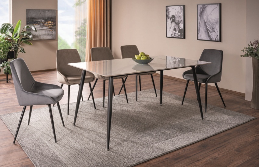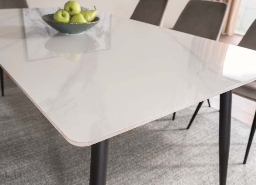 Valkoinen marmorikuvioitu keramiikkakansi yhdistettynä tukeviin mustiin metallijalkoihin tekee pöydästä sekä pitkäikäisen että näyttävän. Kestävä rakenne ja helppohoitoiset pinnat takaavat, että Rion ruokapöytä säilyttää upean ilmeensä vuodesta toiseen.