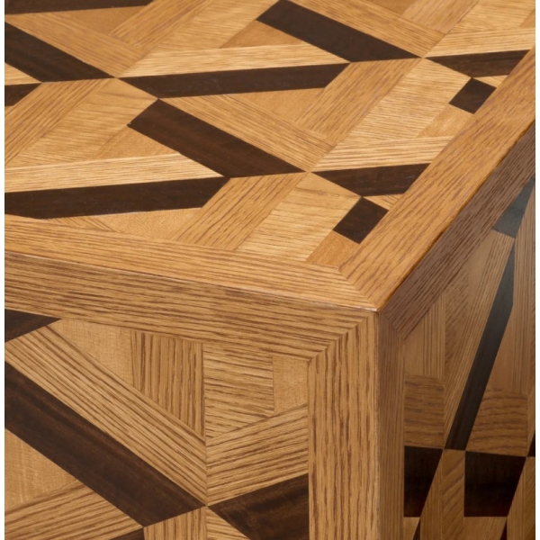 Rubicon sohvapöytä hurmaa upealla inlay-viilukuviollaan, joka vangitsee katseen moniulotteisella syvyydellään ja hienostuneella ilmeellään. Sen graafinen pinta luo elävän ja arvokkaan kokonaisuuden, joka toimii olohuoneen keskipisteenä. Tämä sohvapöytä on suunniteltu tiloihin, joissa arvostetaan modernia muotoilua ja näyttävää, mutta tasapainoista estetiikkaa.