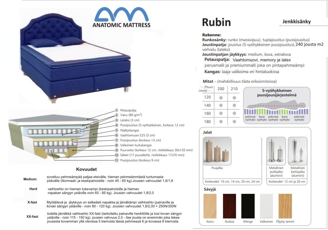 Rubin-jenkkisänky tarjoaa neljä kovuusvaihtoehtoa – medium, hard, X hard ja XX hard – joiden avulla voit säätää sängyn tuen omien tarpeidesi mukaan. Viimeistele nukkumiskokemus kolmesta sijauspatjasta valitsemallasi mallilla: vaahtomuovi-, memory- tai latex-vaihtoehdolla, jotka ovat saatavilla perus- ja premium-versioina. Irrotettavat, vesipestävät päälliset ja useat verhoiluvaihtoehdot tekevät sängystä helppohoitoisen ja tyylikkään lisän makuuhuoneeseesi.