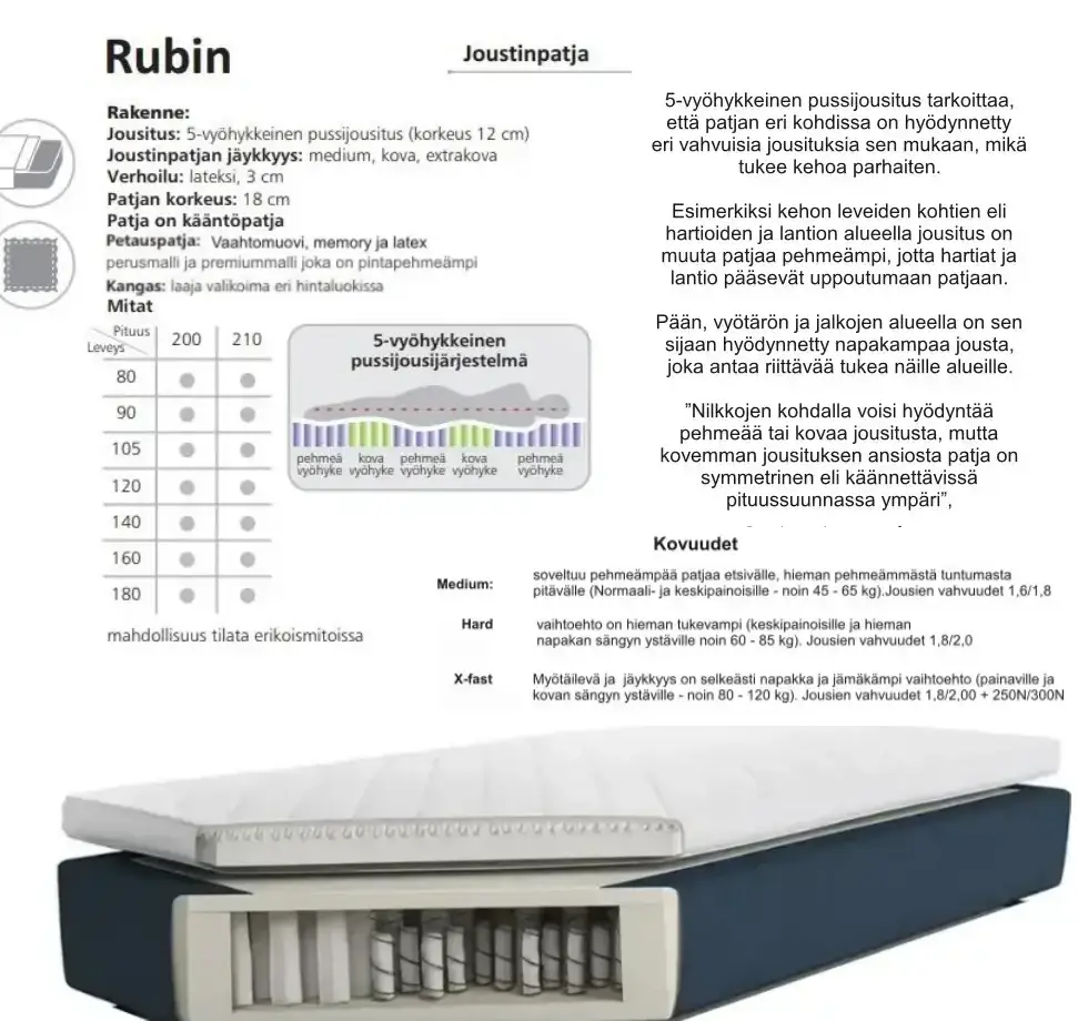 | 80 cm | 210 cm | 18 cm | cm | cm | cm | cm | cm | cm | cm | cm | cm | cm | cm | cm | cm | cm | cm | cm | cm | cm | cm | cm | cm | cm | cm | cm | 80x210 cm | Joustinpatjan korkeus on ilmoitettu ilman sijauspatjaa | Keskikova, Kova, Extra kova | cm | Jousiston yllä ja alla luonnonkumi 3 cm, Reunalla vaahtomuovi E25 7 cm, Vanu 80g/m2, Vetoketju 3 sivulla, Verhoilu valinnainen verhoilukangas/ keskellä sterch kangas, 5 vyöhykkeinen pussijousitus korkeus 12 cm | Ace Kangas | cm | Täystakuu tuotteelle 2 vuotta | Tilaustuote | kg | Viro | cm | cm | cm | Saatavana erikoismittaisena kysy lisää asiakaspalvelusta. |
