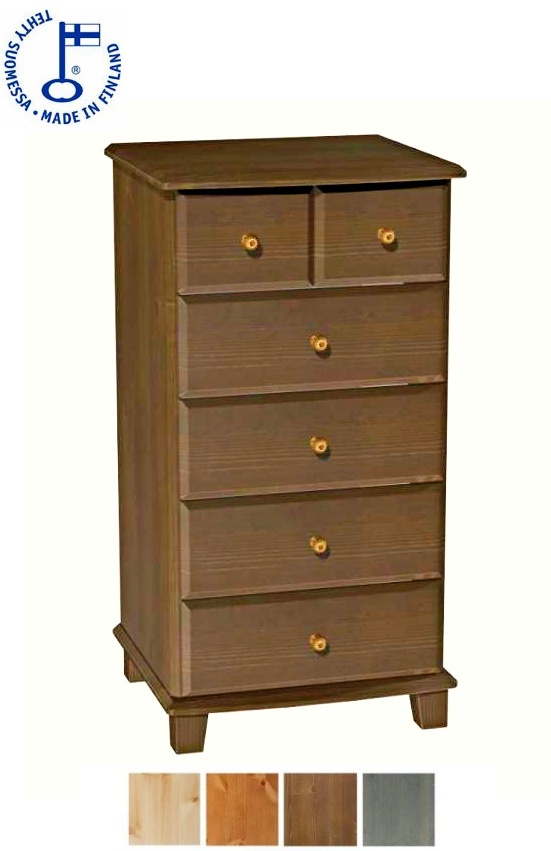 - Korkealaatuinen kotimainen mäntyinen Ruska tuotesarjan laatikosto jossa kaksi pienempää laatikkoa joiden alla neljä laatikkoa metallisilla liukukiskoilla. Ruska tuotesarjaa on saatavana usealla värillä ja kahdella eri vedinvärillä. Tuote toimitetaan osina.