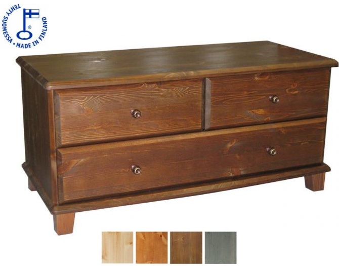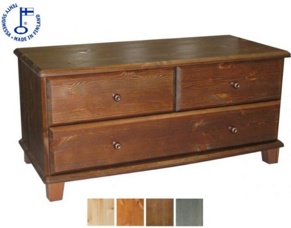 - Korkealaatuinen kotimainen mäntyinen Ruska tuotesarjan laatikosto jossa kaksi kapeaa vierekkäistä laatikkoa joiden alla yksi leveä laatikko metallisilla liukukiskoilla. Ruska tuotesarjaa on saatavana usealla värillä ja kahdella eri vedinvärillä. Tuote toimitetaan osina.