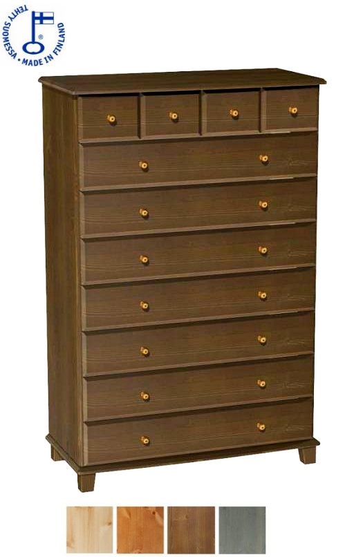 - Korkealaatuinen kotimainen mäntyinen Ruska tuotesarjan laatikosto jossa neljä pientä vierekkäistä laatikkoa joiden alla 7 leveää laatikkoa metallisilla liukukiskoilla. Ruska tuotesarjaa on saatavana usealla värillä ja kahdella eri vedinvärillä. Tuote toimitetaan osina.