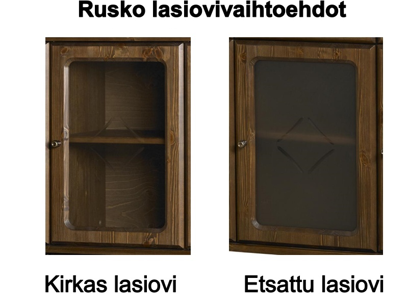 Vitriinin lasiovissa on näyttävät salmiakkikuvioinnit, jotka tuovat siihen ripauksen ylellisyyttä ja hienostuneisuutta. Lasi on saatavilla joko kirkkaana tai etsattuna, joten voit valita juuri omaan sisustukseesi sopivan ilmeen. Rusko Mäntyvitriini 1353008 tarjoaa runsaasti säilytystilaa ja tekee kodin tavaroiden esillepanosta sekä käytännöllistä että kaunista – täydellinen yhdistelmä toiminnallisuutta ja tyyliä.