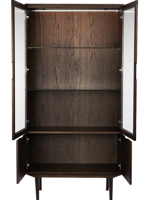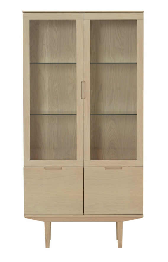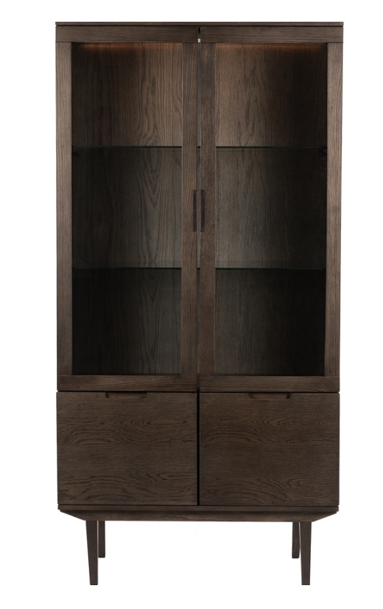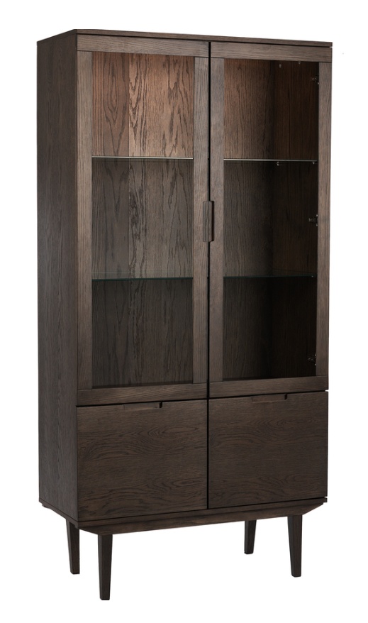 Sagene-vitriini yhdistää elegantin muotoilun ja monipuolisen säilytystilan. Kaksi lasiovea paljastavat lasiset välihyllyt, joissa LED-valaistus tuo esineet kauniisti esille. Alaosassa oleva matala kaappi kahdella ovella tarjoaa lisäsäilytystä. Ovissa kauniit leikatut urat toimivat tyylikkäinä vetiminä, ja vitriini on saatavana kolmessa upeassa värissä.