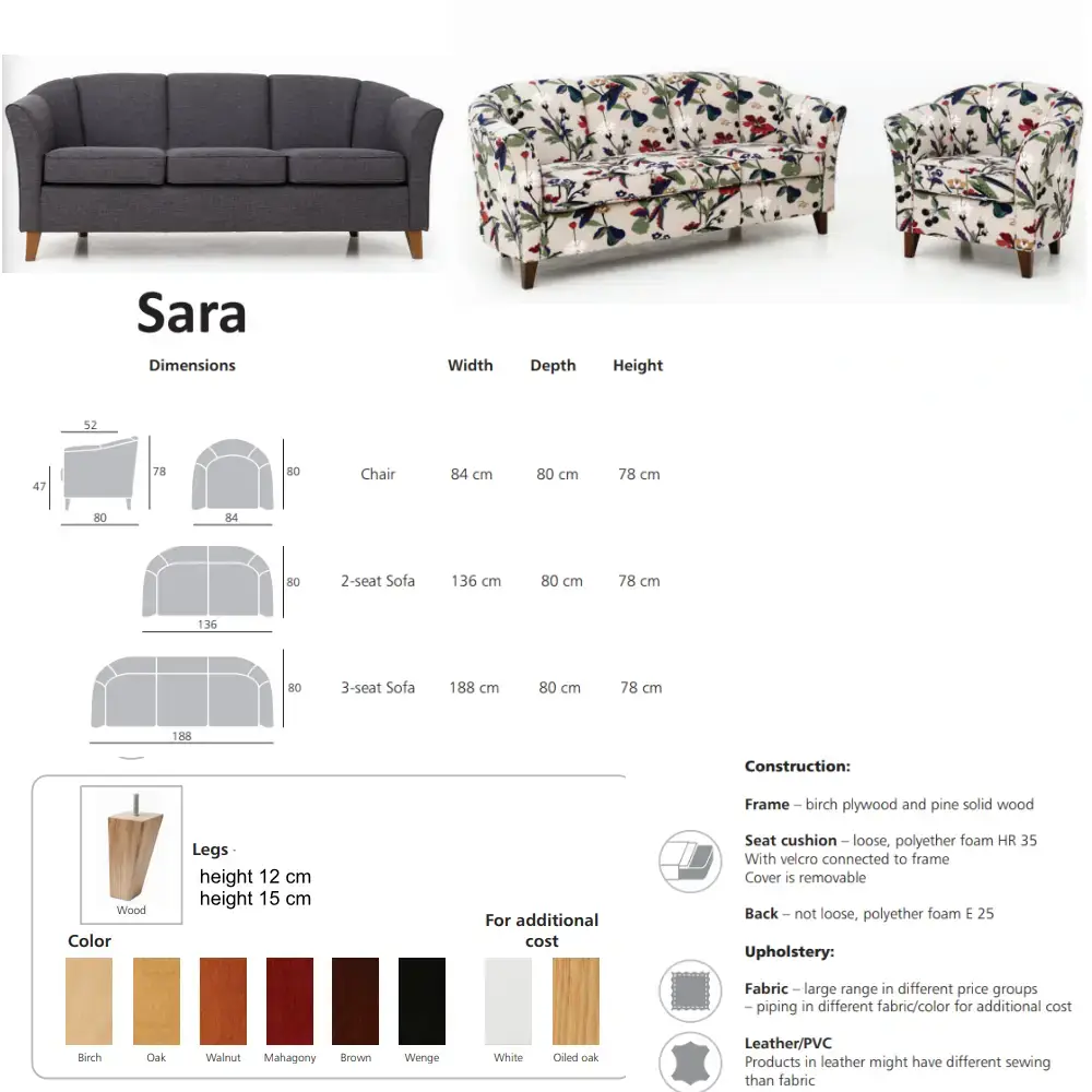 Sara-nojatuoli yhdistää tyylikkään, pieneen tilaan sopivan muotoilun ja napakan istuinmukavuuden, jonka laadukas massiivipuu-/vanerirunko, Nozag-jousitus, laadukkaat pehmusteet sekä laaja verhoiluvalikoima. Tuolia saa myös kuviollisilla vaihtoehdoilla jotka yhdessä tarjoavat kestävän ja kauniin nojatuolin, jonka voit räätälöidä täydellisesti omaan sisustukseesi.