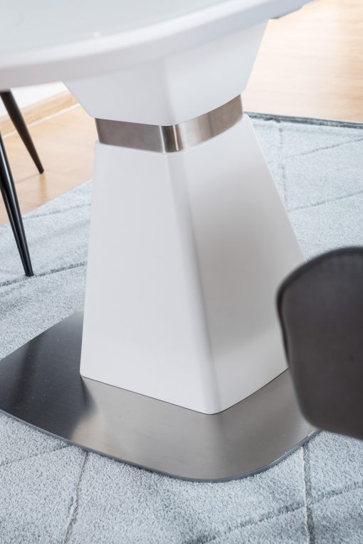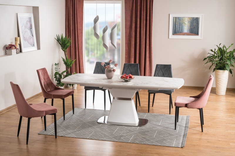 Saturn ruokapöytä yhdistää harmaan marmorijäljitelmän ja mattavalkoisen jalustan, luoden näyttävän ja ajattoman ilmeen, joka sopii täydellisesti moderniin sisustukseen. Sen selkeälinjainen kokonaisuus tekee pöydästä tyylikkään katseenvangitsijan, joka toimii ruokailutilan eleganttina keskipisteenä.