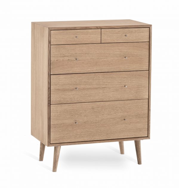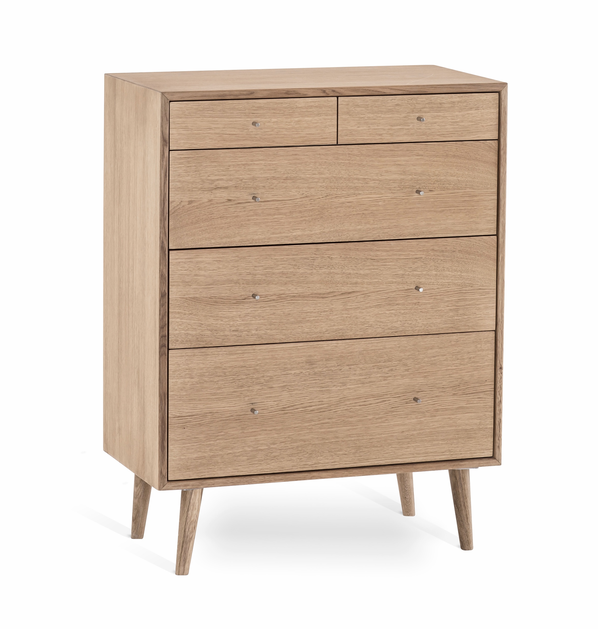 - Upea öljytystä tammesta valmistettu Scandi lipasto jossa 3 leveätä laatikkoa ja niiden päällä 2 kapeampaa. Laatikoissa kaunis metallivedin, jalka massiivitammea. Toimitus kasattuna.