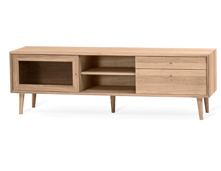 TV-tasossa on vasemmalla kaappi lasiovella, keskellä kaksi avointa hyllyä medialaitteille ja oikealla kaksi laatikkoa piilotettuun säilytykseen. Laatikoissa on kauniit hopeanväriset metallivetimet ja soft-close-mekanismi, ja massiivitammesta valmistetut jalat viimeistelevät laadukkaan ja kestävän rakenteen.
