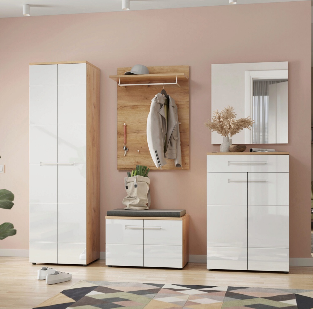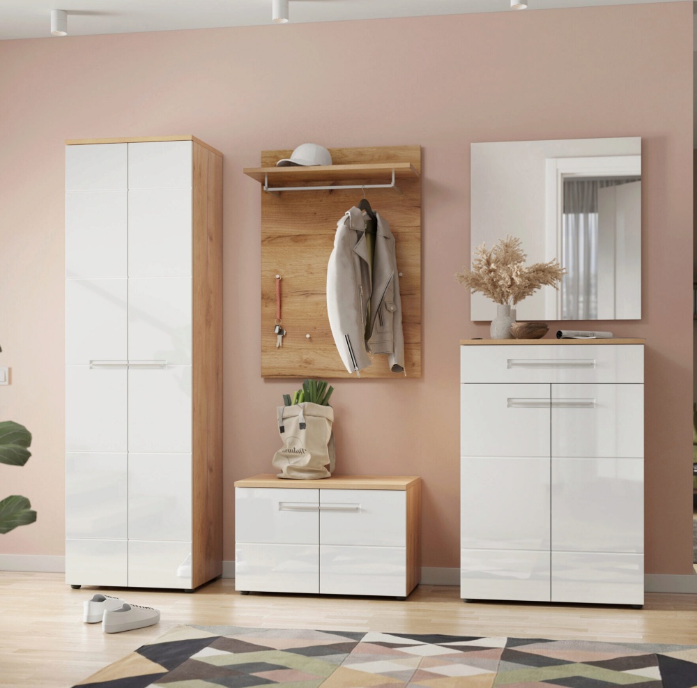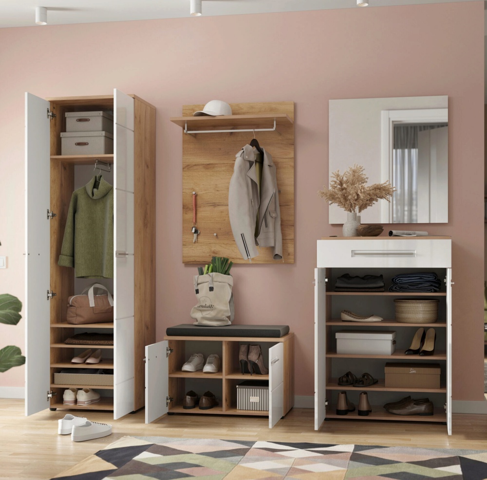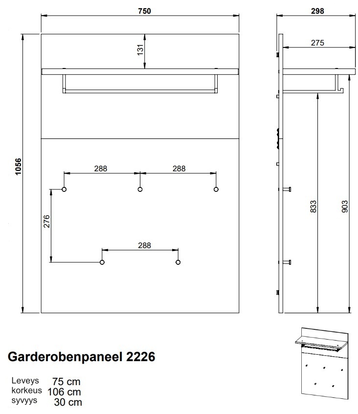 Neljä metallikoukkua, vaatetanko ja käytännöllinen hattuhylly tarjoavat runsaasti tilaa takeille, hatuille ja asusteille. Selkeä rakenne pitää eteisen siistinä ja tekee arjen pukeutumisesta sujuvaa.