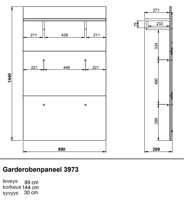 Neljä tukevaa koukkua, kaksi vaatetankoa ja kätevä hattuhylly tarjoavat runsaasti tilaa takeille, laukkuille ja asusteille. Monipuolinen rakenne helpottaa päivittäisten tavaroiden järjestämistä ja pitää eteisen siistinä ja toimivana.