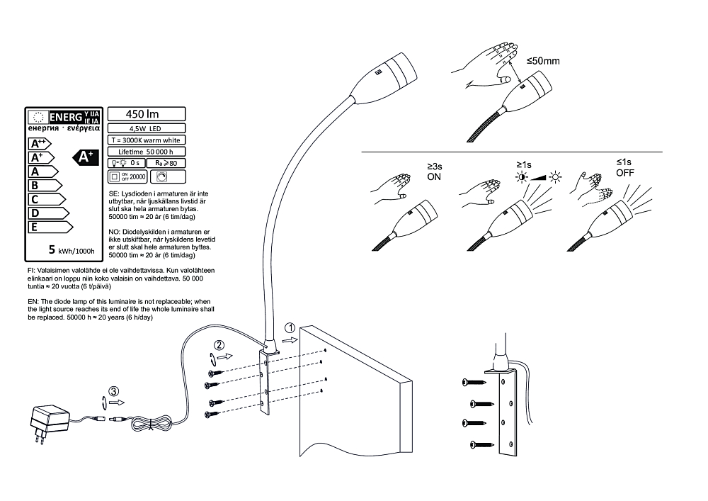 Metallirunkoinen Sensilo seinävalaisin joka voidaan kiinnittää helposti esimerkiksi sängynpäätyyn. Integroitu himmenninkytkin. Valaisimen asento säädettävissä. Pistotulppajohto tilattavissa erikseen lisätarvikkeista sivun alareunassa.