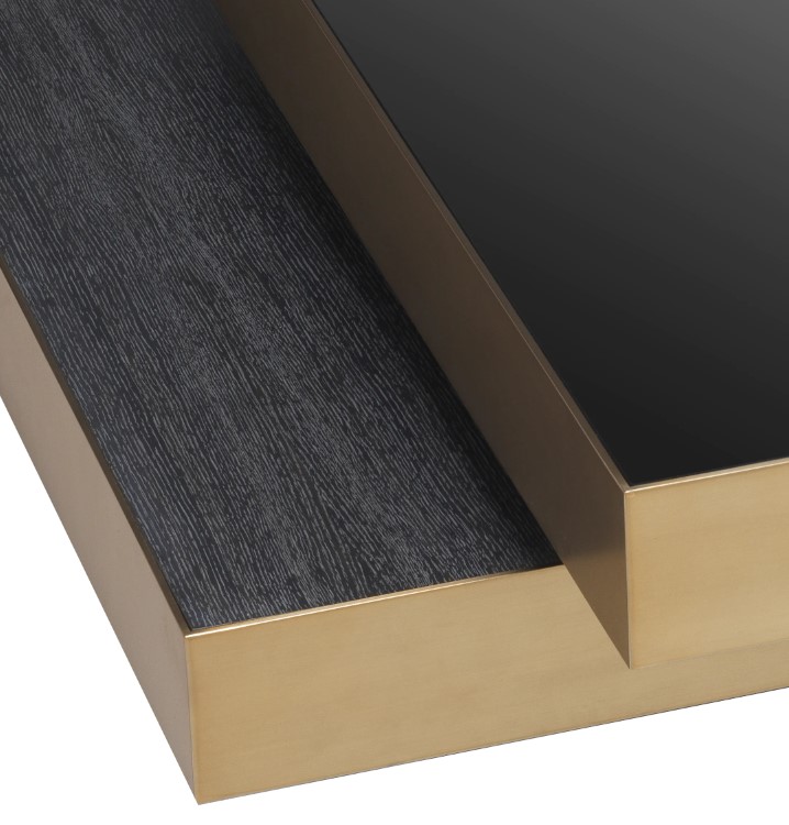 Shelton-sohvapöytä yhdistää harjatun messinkireunuksen, mustan lasin ja hiilenharmaan tammiviilun näyttäväksi kokonaisuudeksi, joka tuo olohuoneeseesi modernia eleganssia. Sen monipuolinen värimaailma ja viimeistelty ulkonäkö tekevät pöydästä sisustuksen keskipisteen, joka korostaa huoneen harmonista ilmettä.