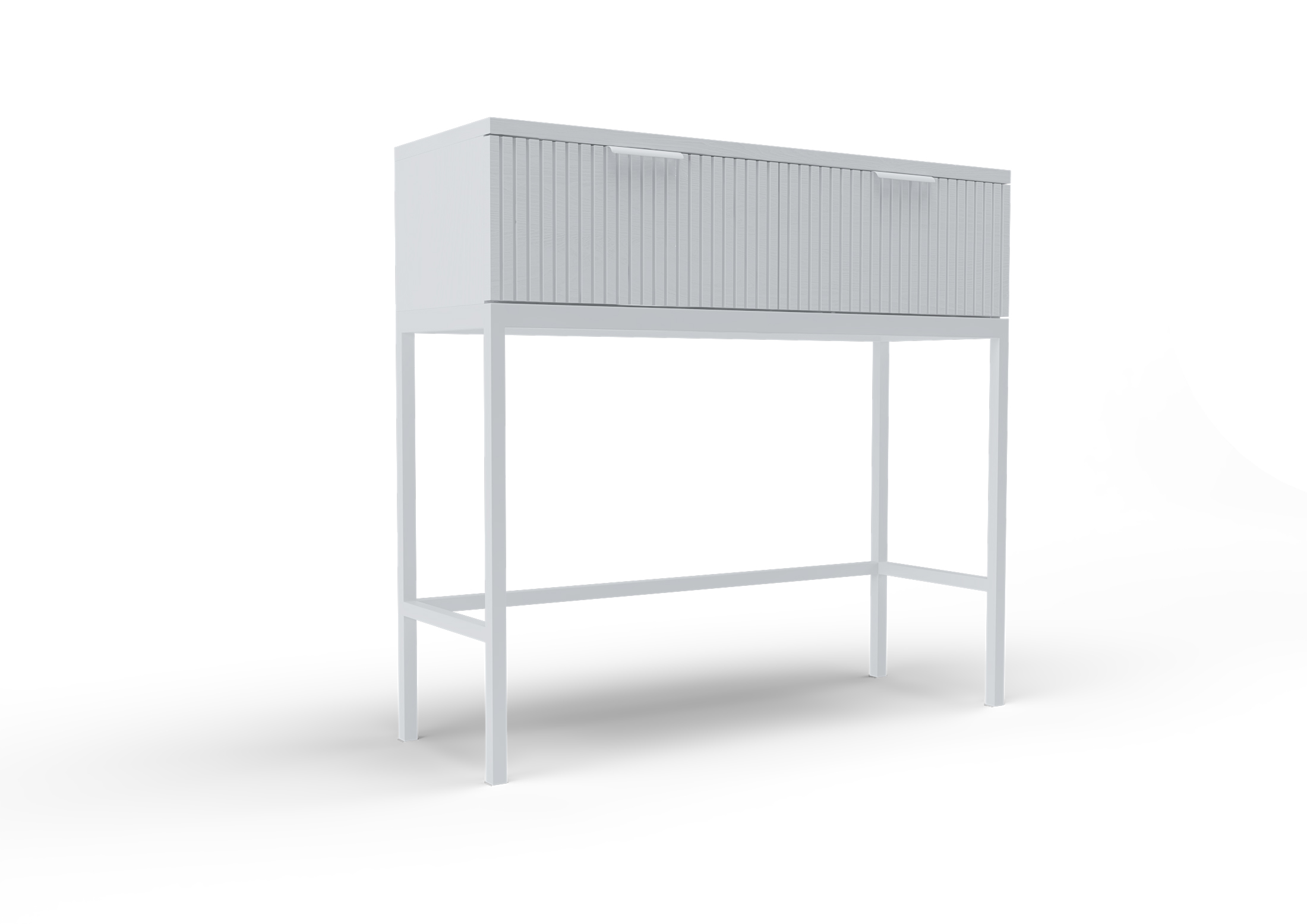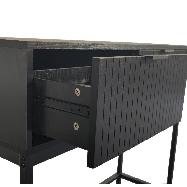 Konsolipöytä on valmistettu 3D-puukuvioidusta melamiinista, joka yhdistää aidon puun luonnollisen ilmeen ja helppohoitoisuuden. Tukevat metallijalat ja moderni vedin tuovat kokonaisuuteen ryhtiä ja kestävyyttä, korostaen samalla pöydän eleganttia ja nykyaikaista ilmettä.