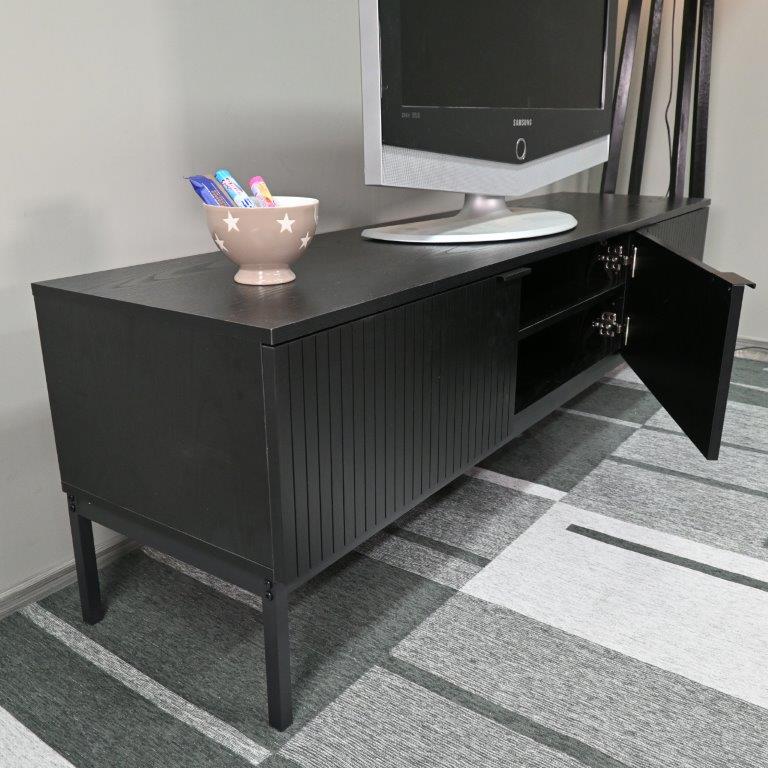 Viihdetason runko on valmistettu 3D-puukuvioidusta melamiinista, joka yhdistää aidon puun luonnollisen ulkonäön ja helppohoitoisuuden. Metallijalat ja vetimet tuovat kokonaisuuteen modernia kontrastia ja kestävyyttä. Korkeussäädettävät hyllyt mahdollistavat tilan muokkaamisen juuri omien säilytystarpeidesi mukaan – olipa kyse mediatarvikkeista, kirjoista tai koriste-esineistä.