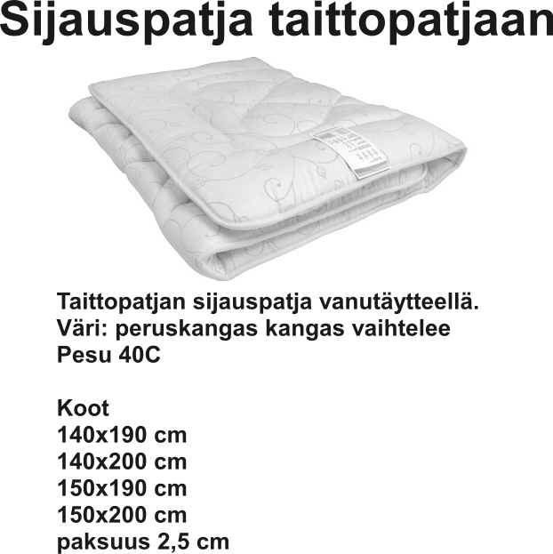 Taittopatjan sijauspatja vanutäytteellä tuo selkeän parannuksen taittopatjan nukkumamukavuuteen. Pehmeä mutta sopivan tukeva vanutäyte tasaa patjan pintaa ja tekee nukkumisesta miellyttävämpää niin satunnaisessa vieraskäytössä kuin pidempiaikaisessakin käytössä.