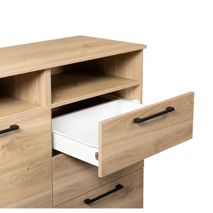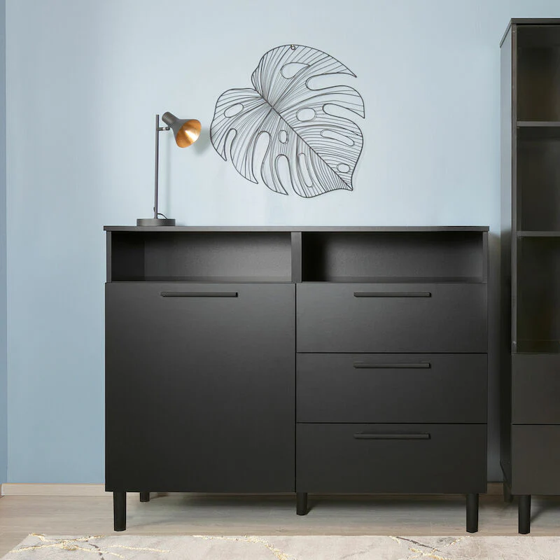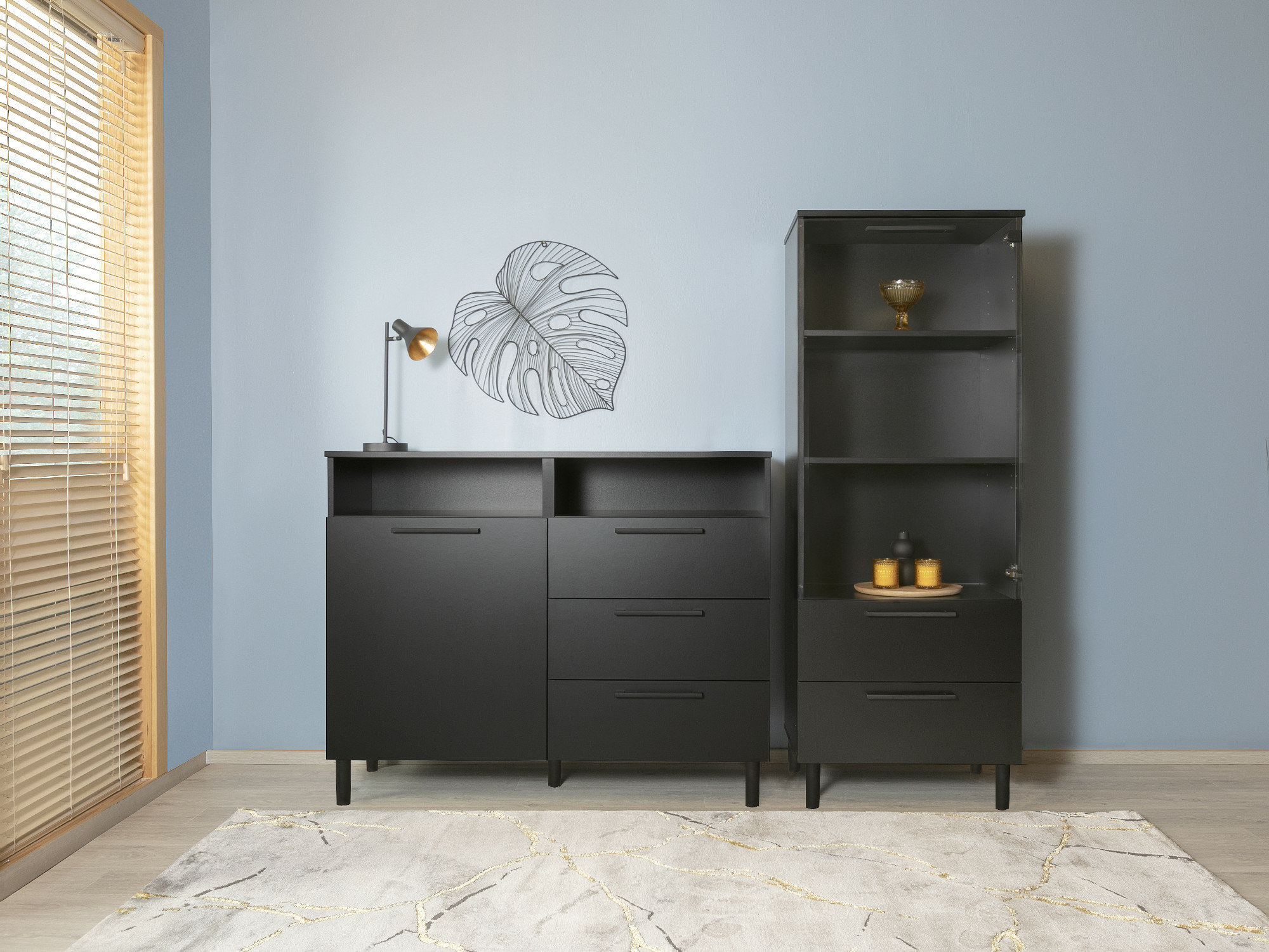 Kaapissa on yksi korkeussäädettävä hylly, kolme laatikkoa hidastusmekanismeilla sekä kaksi avointa hyllyä, jotka tarjoavat joustavasti tilaa arjen tavaroille. Lisäksi Solo lipastokaappi on täydellisesti yhteensopiva muiden Solo-sarjan tuotteiden, kuten vitriinin ja tv-tason, kanssa – luoden harmonisen ja yhtenäisen kokonaisuuden kotiisi.