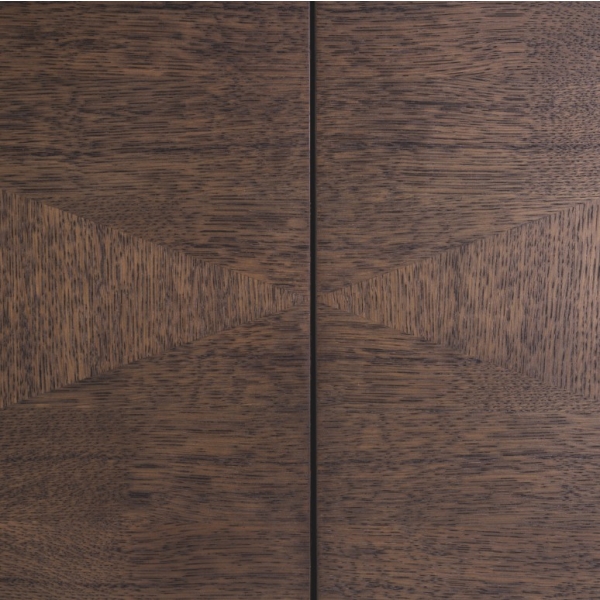 Ovien hienovarainen ja kaunis viilukuviopinta tuo kalusteeseen elävyyttä ja yksityiskohtaista ilmettä. Harjattu messinkiviimeistely korostaa kokonaisuutta ja lisää ripauksen glamouria, tehden Sonestasta todellisen sisustuselementin. Yhdistelmä luonnollista puuviilua ja metallisia yksityiskohtia luo ajattoman ja arvokkaan kokonaisuuden.