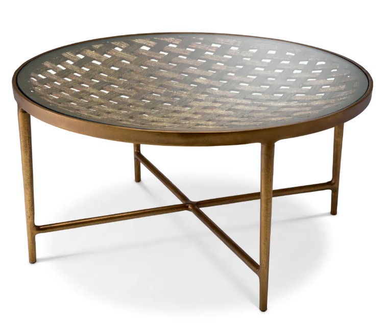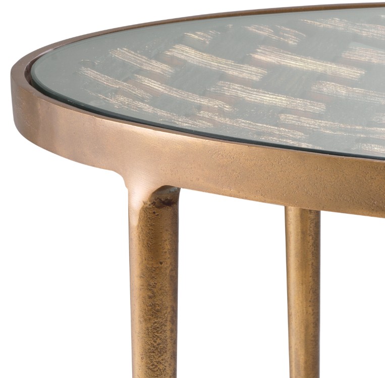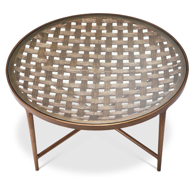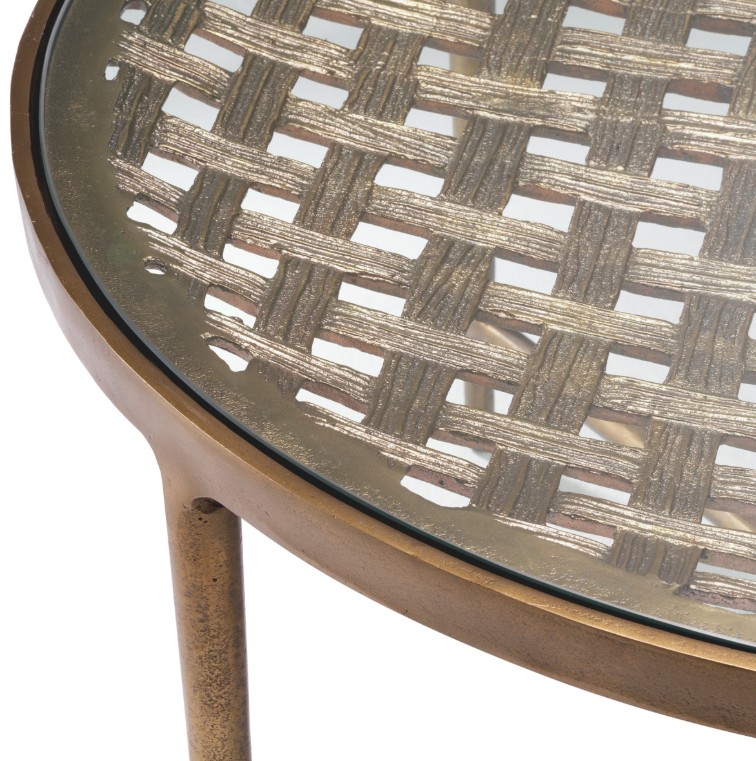 Pöydän vintage-messinkinen viimeistely yhdistyy näyttävään kulhomaiseen muotoon, jonka punottu kuviointi näkyy kauniisti kirkkaan lasikannen läpi. Tämä ainutlaatuinen rakenne luo syvyyttä ja visuaalista kiinnostavuutta, tehden pöydästä todellisen katseenvangitsijan.