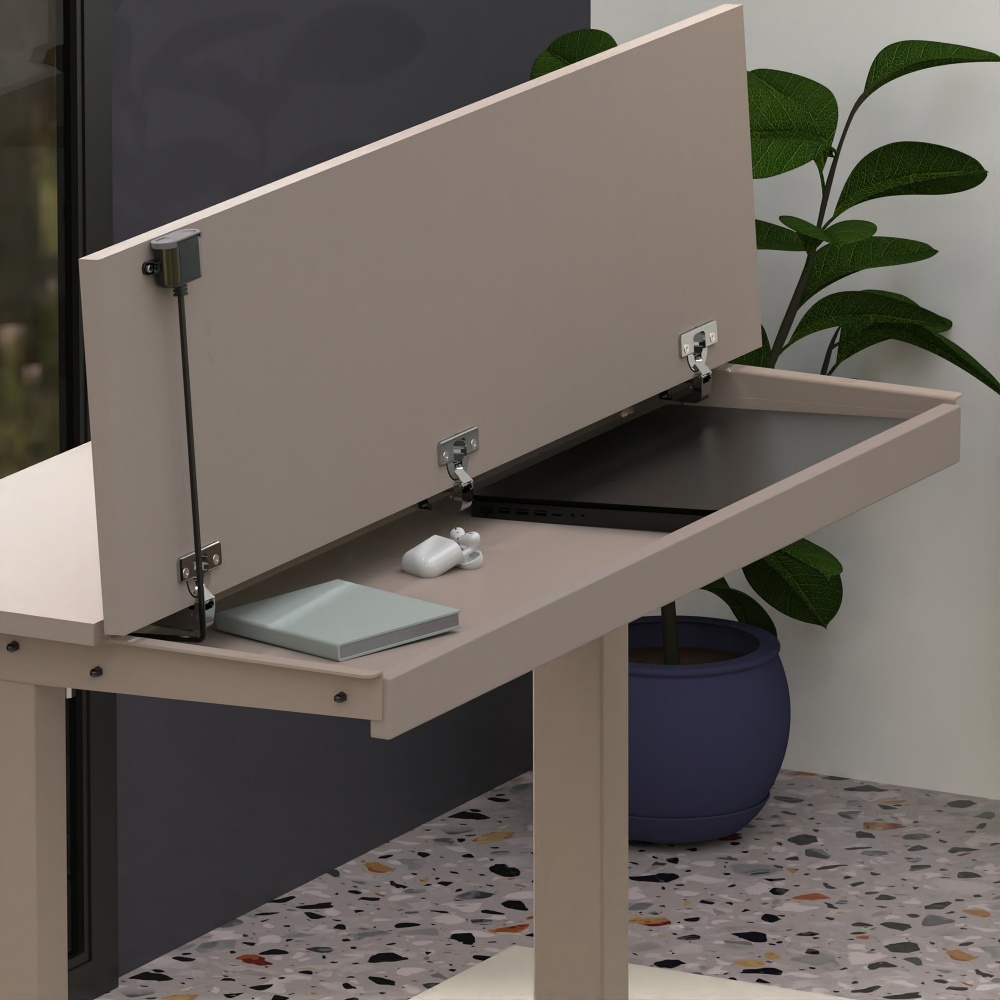 Slipt on sähkökäyttöinen työpöytä jossa on säilytystilaa kannen alla. Säilytä paperisi, koneesi kannen alla kunne tarvitset niitä sillä pöytätason alla olevaan säilytystilaan mahtuu helposti kannettava tietokone ja tyypilliset toimistotarvikkeet, ja pöydän alla on vielä jalkatilaa mukavasti istuakseen. Split kirjoituspöytä on tyylikäs huonekalu sijoitat sen kotonasi mihin vain samalla parannat kodin ergonomiaa ja mukavuutta. Työpöytä ei näytä perinteiseltä korkeussäädettävältä pöydältä, mutta siinä on kaikki perinteisen sähköisen tuöpöydän edut säilytystilalla. Splitissä on saranoitu pöytälevy, jonka alla on piilotettu säilytystila, joka auttaa pitämään asuintilasi järjestyksessä.