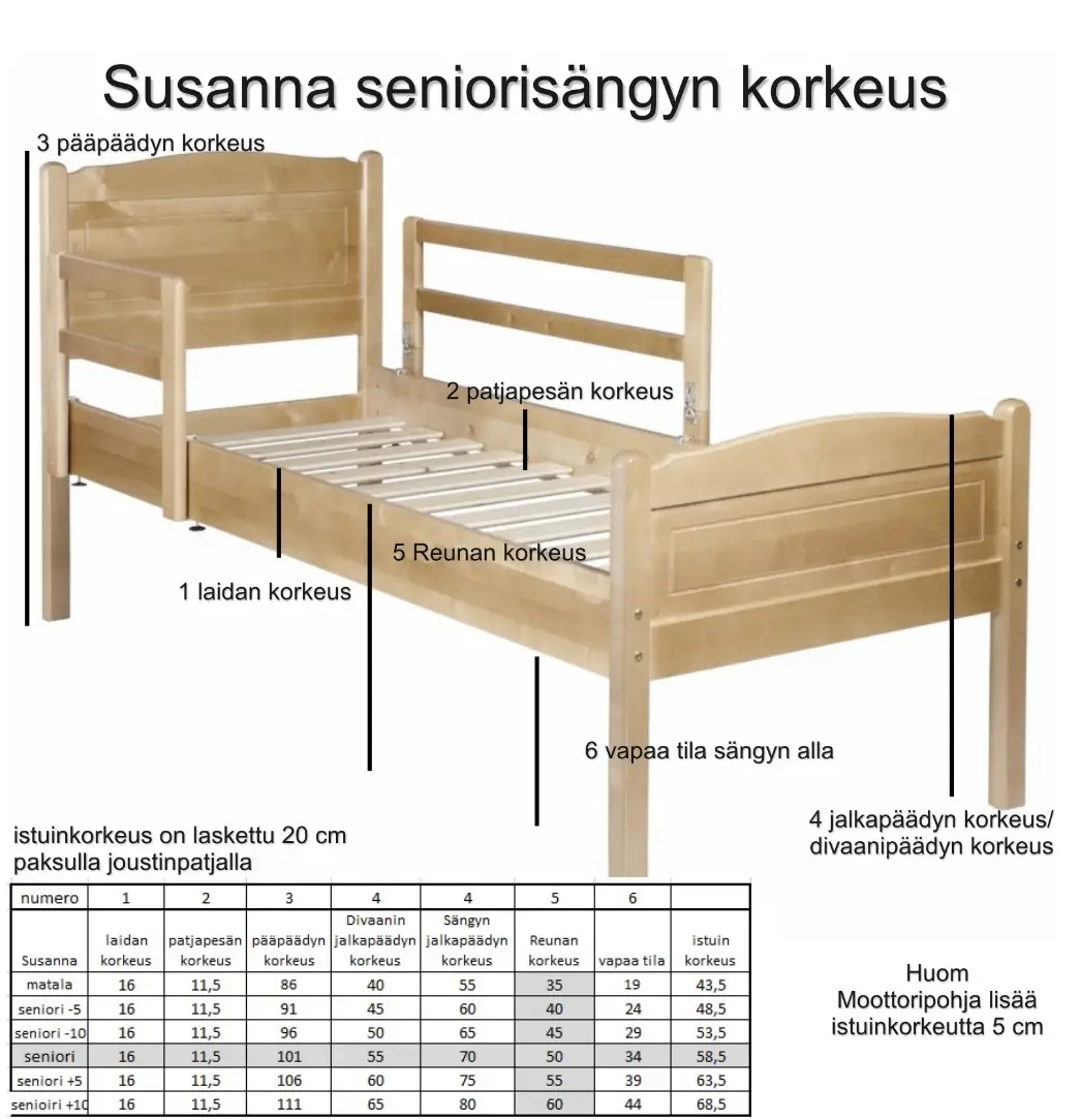 Susanna seniorisänky on Suomessa valmistettu koivurunkoinen laatutuote, joka tarjoaa erinomaisen kestävyyden ja turvallisen nukkuma-alustan. Sälepohja lisää joustavuutta ja mukavuutta, ja tukeva rakenne kestää vuosien käytön loistavasti. Sänky on saatavana sekä perinteisenä jalkapäädyllisellä mallilla että modernina divaaniversiona ilman jalkapäätyä – myös erikoiskoot onnistuvat helposti.