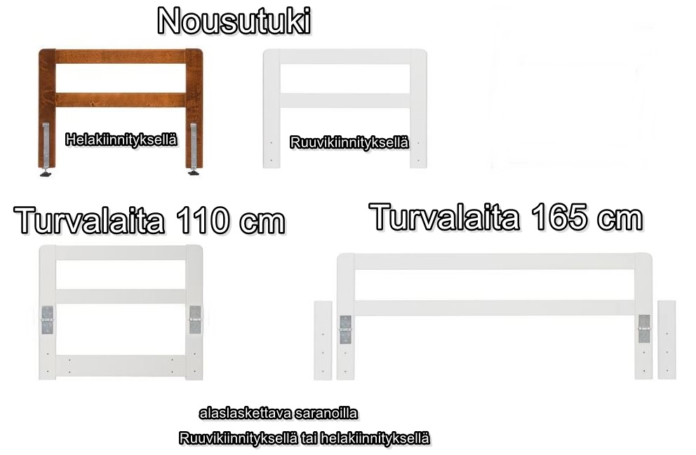 Turvalaitaa on saatavana kahdella kiinnitysmallilla: ruuvikiinnitteinen versio sopii kaikkiin sängynlaitoihin, kun taas helakiinnitteinen laita voidaan helposti irrottaa ja asentaa takaisin tarpeen mukaan. Helakiinnitys sopii erityisesti 16 cm korkeisiin ja 25 mm vahvuisiin laitoihin (esim. Dreams, Laatu Laveri, Peggy, Susanna ja Sonaatti).