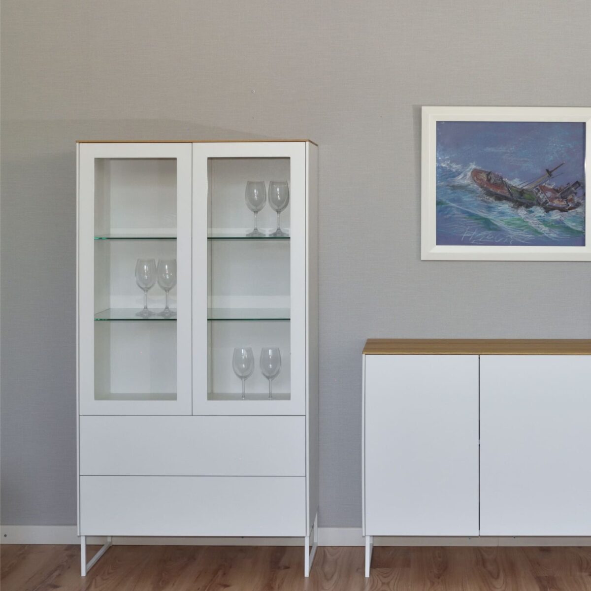 Suvi vitriini yhdistää linjakkaan muotoilun ja laadukkaat materiaalit, tarjoten harmonisen ja käytännöllisen säilytysratkaisun kotiin. Se on varma valinta, kun haluat tyylikkään, pitkäikäisen ja helposti yhdisteltävän kalusteen.