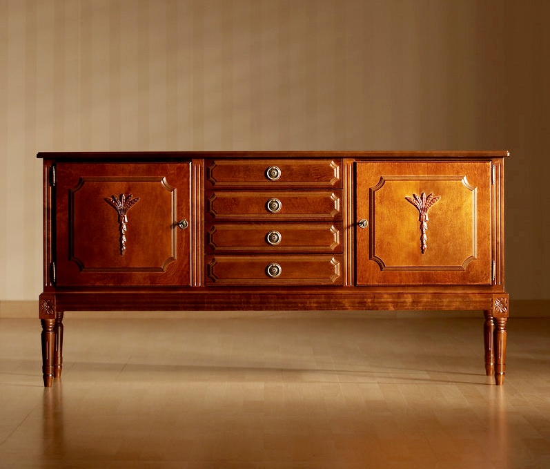 Tämä näyttävä empiretyylinen astiakaappi on yhtä aikaa käytännöllinen ja arvokas sisustuksen katseenvangitsija. Molemmissa reunoissa on kaapit korkeussäädettävillä hyllyillä ja keskellä neljä tilavaa laatikkoa, jotka tarjoavat runsaasti säilytystilaa.