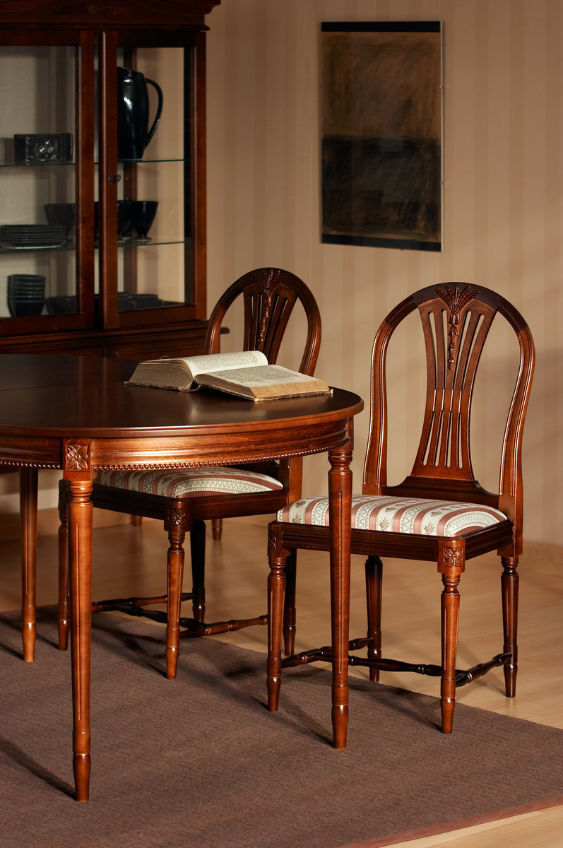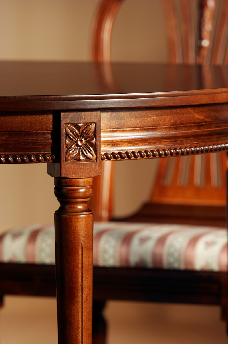 Empiremalliston klassinen muotokieli yhdistää antiikin Rooman ja muinaisen Egyptin vaikutteet pohjoismaiseen maltillisuuteen, ja pöytä sopii täydellisesti myös kustavilaisten kalusteiden rinnalle. Halutessasi pöytä voidaan viimeistellä käsin maalatulla kullan- tai harmaanvärisellä patinoinnilla, joka korostaa sen kauniita yksityiskohtia.